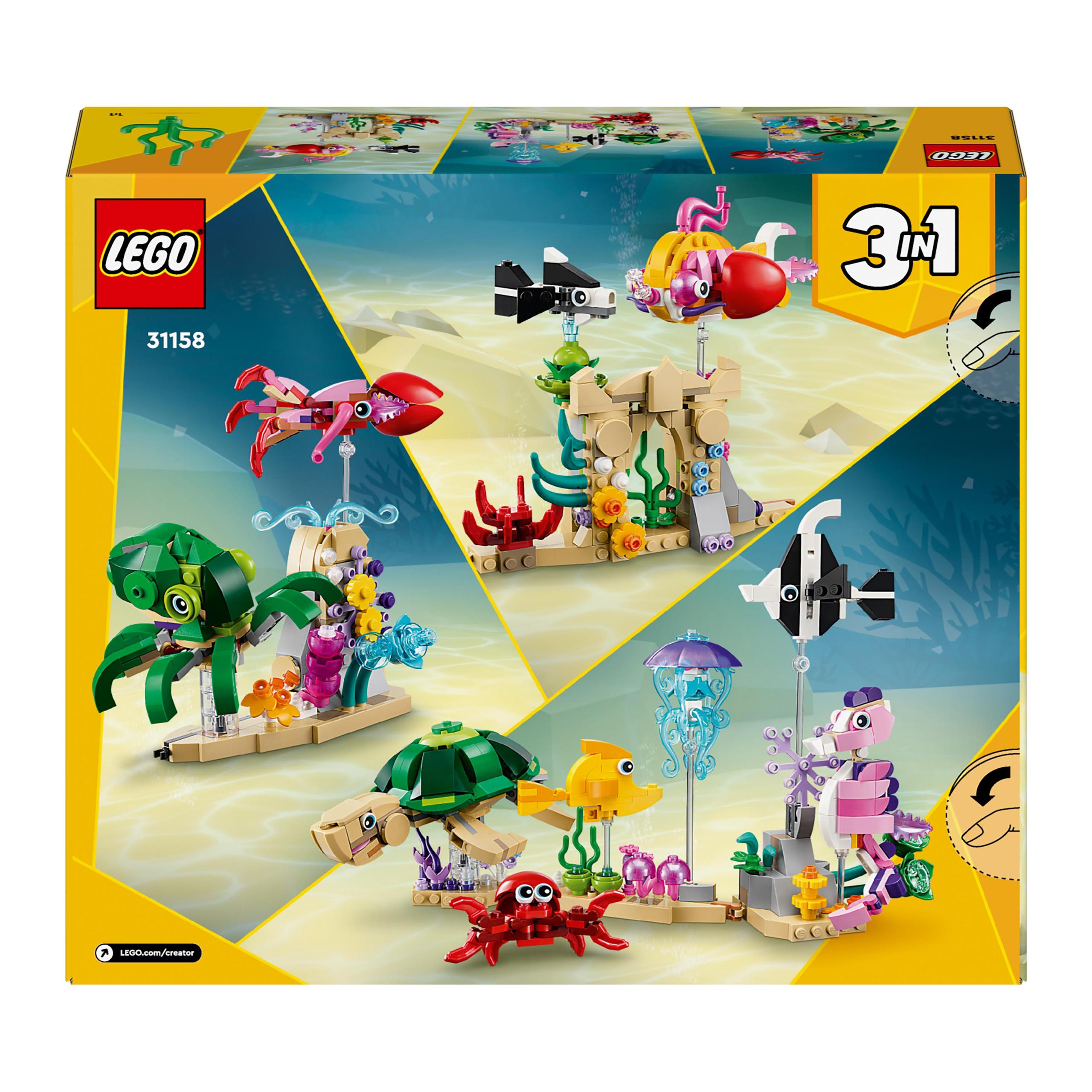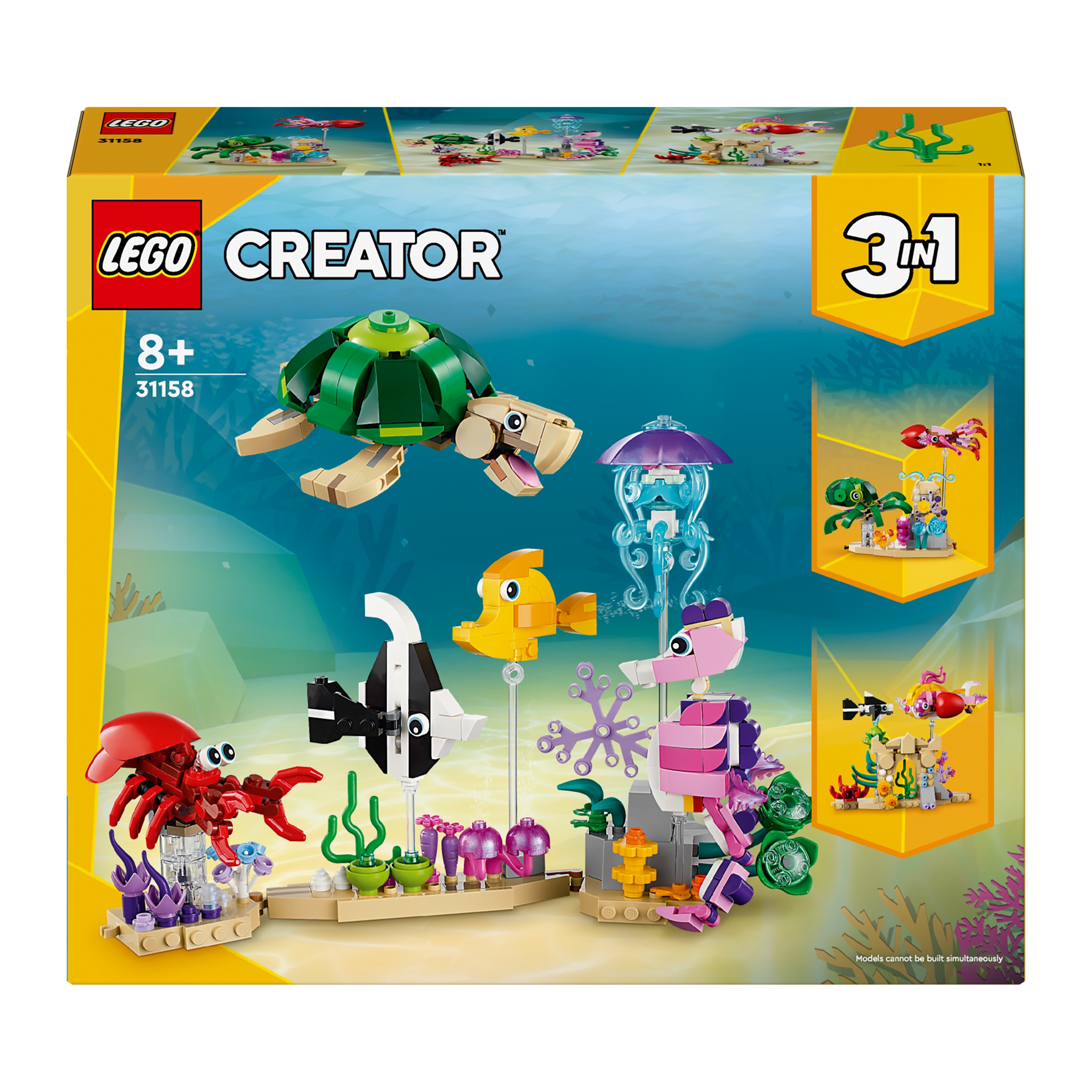 Дети в возрасте от 8 лет и старше могут собирать и играть с этим красочным набором «Морские животные» LEGO® Creator 3-в-1 (31158) или ставить его на полку. В набор входят две рыбки, черепаха, медуза и морской конек, размещенные на прозрачных элементах, имитирующих морское дно, украшенное морскими растениями, а также фигурка красного краба. Фигурки морских существ можно разместить на подставке, которую можно выпрямлять или наклонять.
