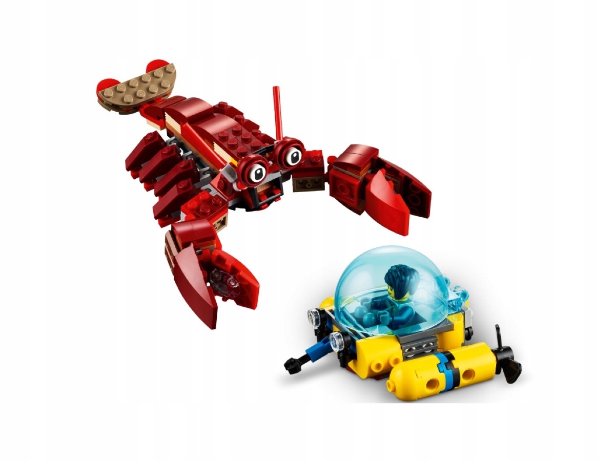 Этот LEGO 3-в-1 Набор Creator позволяет детям собрать три различные модели для игры. Дети могут начать со сборки моделей батискафа и осьминога, а затем перестроить их в батискаф меньшего размера и большого омара. Вы также можете создать сцену с участием большого ската и дайвера на коралловом рифе. Конечно, ничто не мешает вам использовать свое воображение и построить из кубиков что-то совершенно новое.