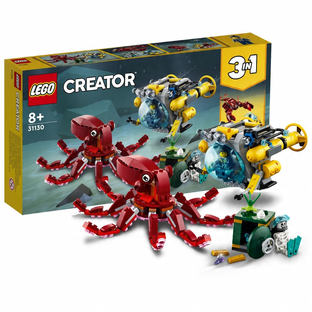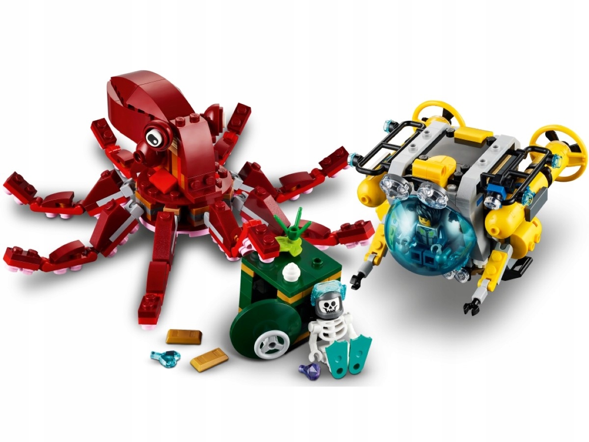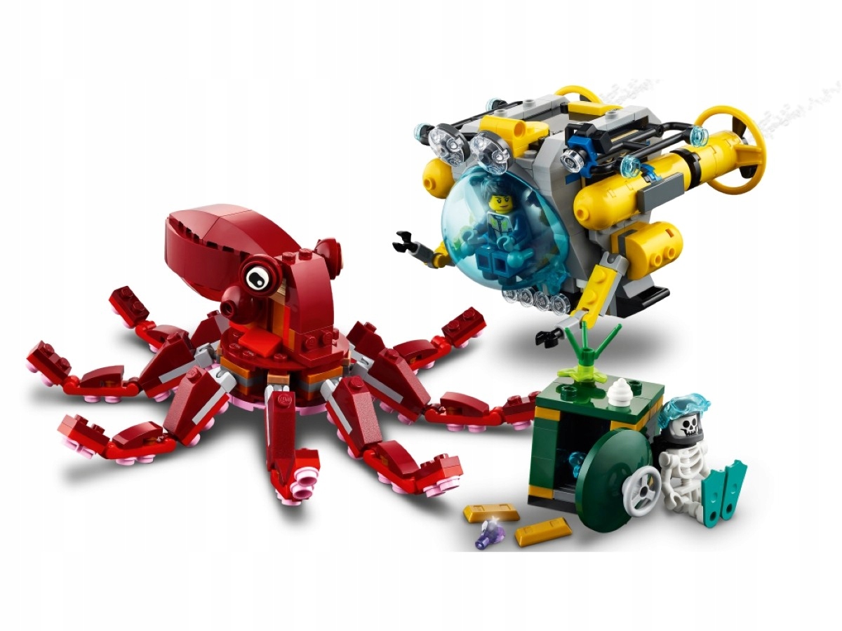 Дети в возрасте от восьми лет и старше могут насладиться захватывающими подводными приключениями с удивительным набором LEGO® Creator 3in1 3in1 «Экспедиция затонувших сокровищ» (31130). В набор входит удивительный батискаф, большой игрушечный осьминог, 2 минифигурки и сейф с золотыми слитками и драгоценными камнями.