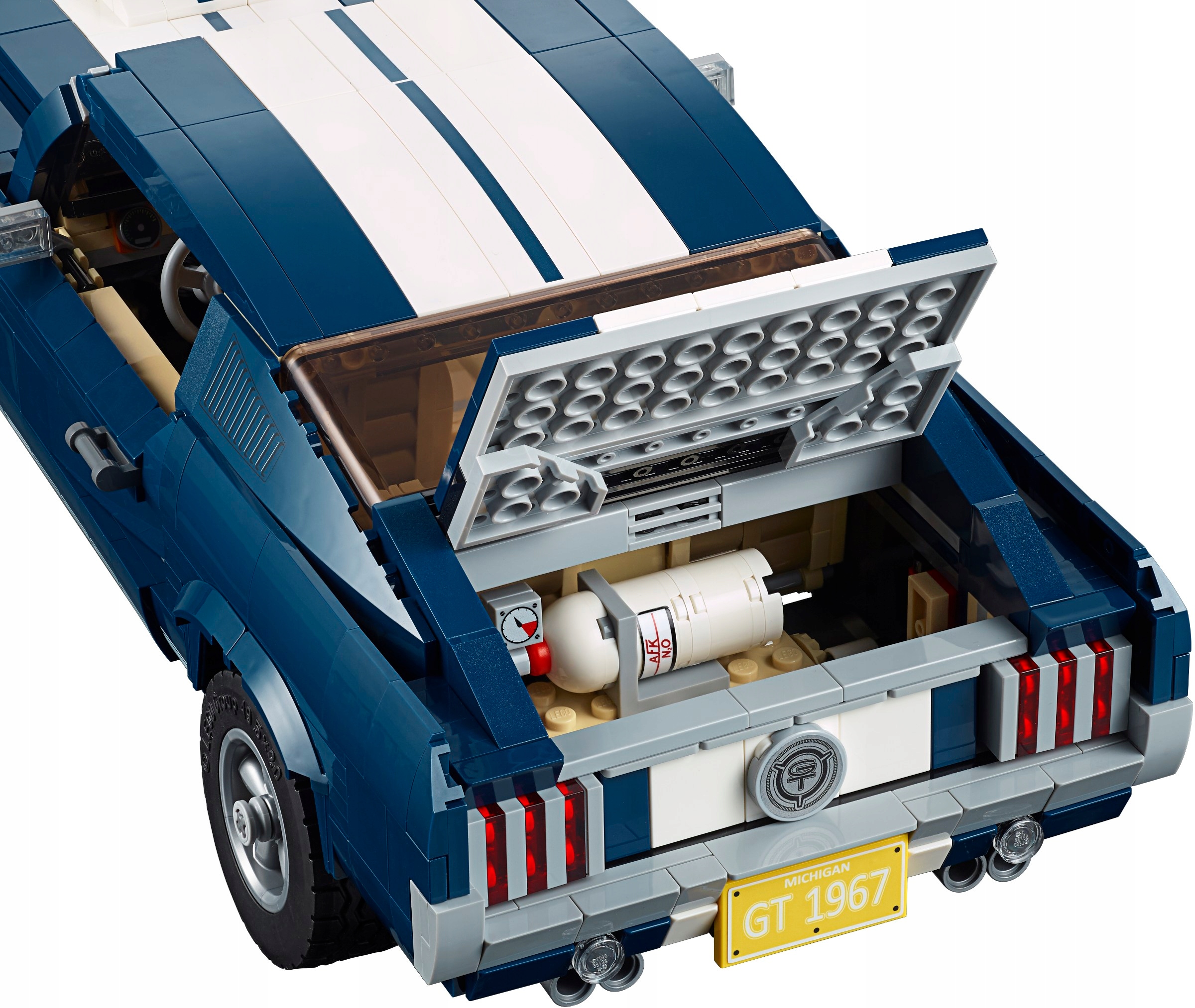Ощутите волшебство культового американского маслкара 1960-х годов с набором Ford Mustang LEGO® Creator. Модель имеет темно-синий кузов, белые гоночные полосы, ковш на капоте, логотип Mustang на решетке радиатора, логотип GT, цепкие шины и впечатляющие пятиспицевые диски. Реплика, подготовленная в сотрудничестве с Ford, может быть оснащена рядом дополнительных элементов, таких как различные номерные знаки, турбокомпрессор, задний спойлер «уточный хвост», огромные выхлопные трубы, передний спойлер на подбородке и бак закиси азота. А если вы хотите, чтобы ваша машина выглядела еще агрессивнее, вы можете изменить высоту задней оси! Откройте двери или снимите панель крыши, чтобы облегчить доступ к детализированному салону с элегантными сиденьями, радио, работающим рулевым управлением и коробкой передач на центральной консоли. Затем положите что-нибудь в багажник или поднимите капот, чтобы поближе рассмотреть детализированный двигатель Big Block V8 390 с аккумулятором, шлангами и воздушным фильтром. Сборка этого расширенного набора станет интересной строительной задачей с оттенком ностальгии, а сама модель станет прекрасным украшением вашего дома или офиса.