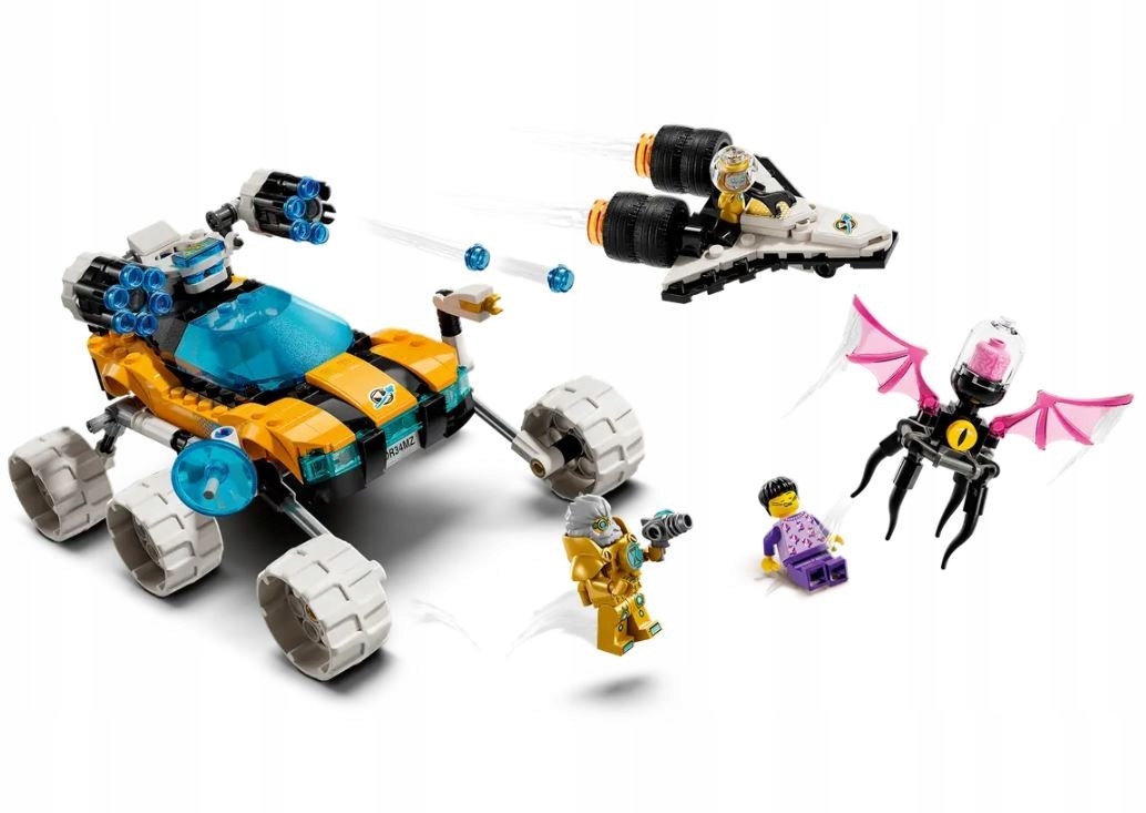В космической машине LEGO® Dreamzzz ™, Mr. Oza, Спящий Джейден был захвачен ночным маркером! Мистер Оз вошел в мир мечты, чтобы спасти его, но его машина сломалась, и ему нужна ваша помощь. Преобразовать автомобиль в космический корабль или вне -дорогостоящий космический ровер. У космического парома есть пушки с стрельбой, а у ровера хорошая захватывающая рука! Готовы взлететь?
