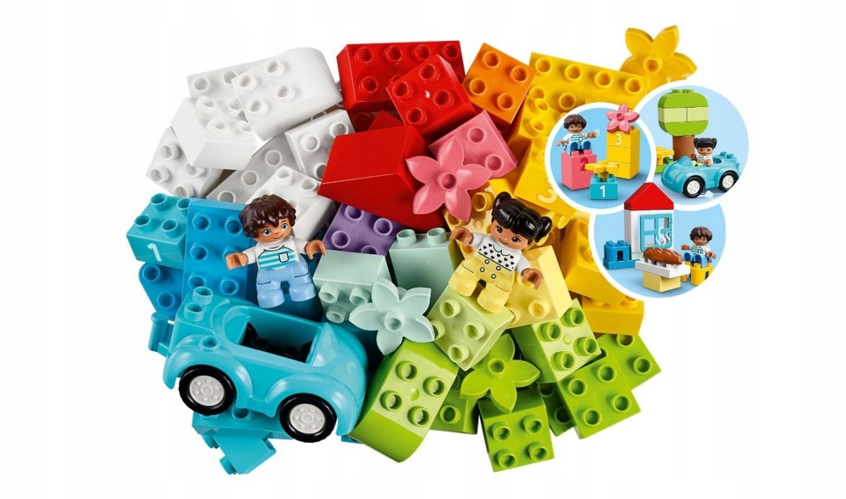 - В набор входят 65 разноцветных кубиков и знакомые элементы, стимулирующие детское воображение. К ним относятся машина с движущимися колесами, крыша, окно, цветы, багет, фигурки DUPLO и кубики с цифрами от 1 до 3.