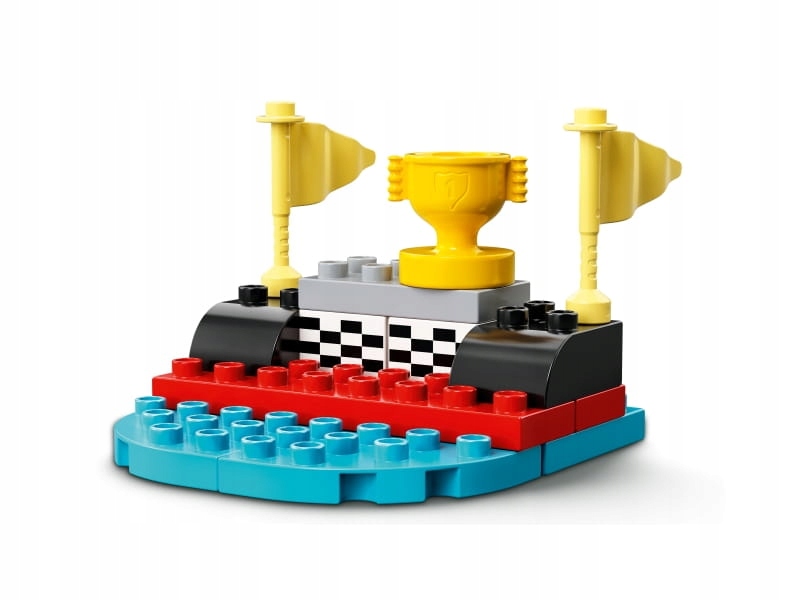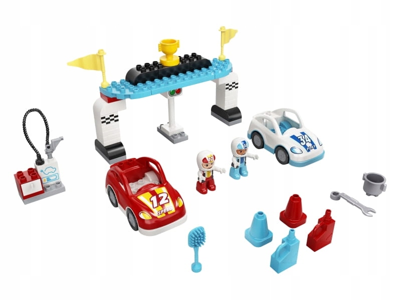 В комплект входят две фигурки гонщиков DUPLO® в шлемах (мужчина и женщина), а также две откатные машины и аксессуары, включая приз, флаги, зарядную станцию для электромобилей, конусы и инструменты.