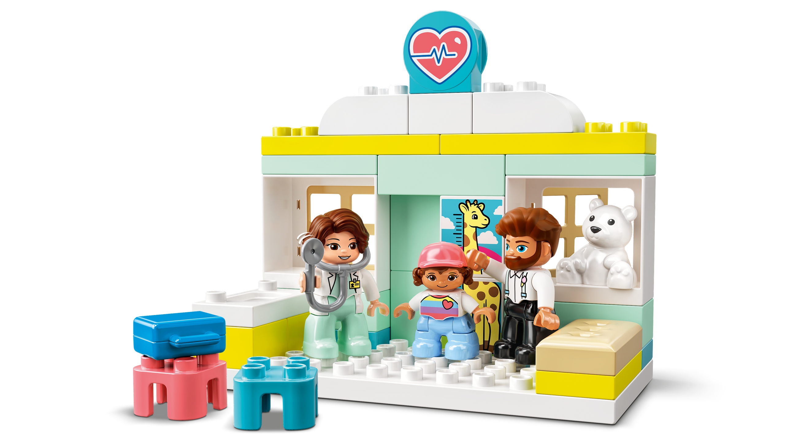 - Внутри полно аттракционов - в набор входят три фигурки LEGO DUPLO: врач, папа и ребенок, а также плюшевый мишка, таблица роста с жирафом, умывальник, кушетка, открывающийся чемодан и два стула.