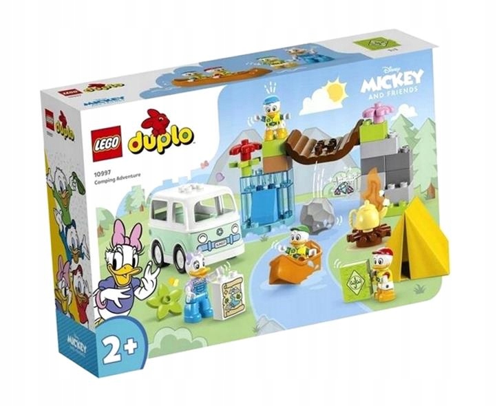 Множество знакомых персонажей, в том числе каноэ, кемпер на колесах и тканевая палатка, а также 4 фигурки LEGO(R) DUPLO(R): Дейзи Дак и племянники Диснея Хизио, Дизио и Зизио.