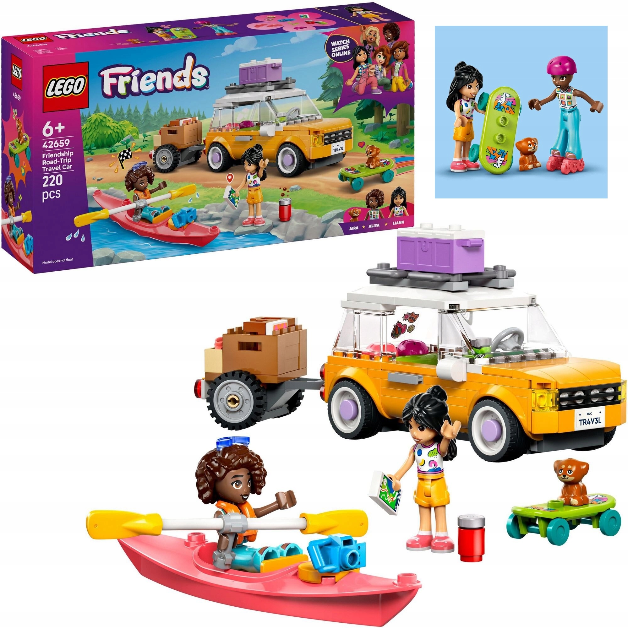 С набором LEGO Friends Friends Car Trip (42659) дети от шести лет и старше попадут в мир, полный приключений. Включает автомобиль с прицепом, 2 фигурки мини-кукол LEGO Friends, очаровательную фигурку щенка и множество аксессуаров, включая каяк, 2 шлема, скейтборд, роликовые коньки, 2 стула и холодильник с сэндвичем, пончиком, печеньем, вишней и лакомствами для собак