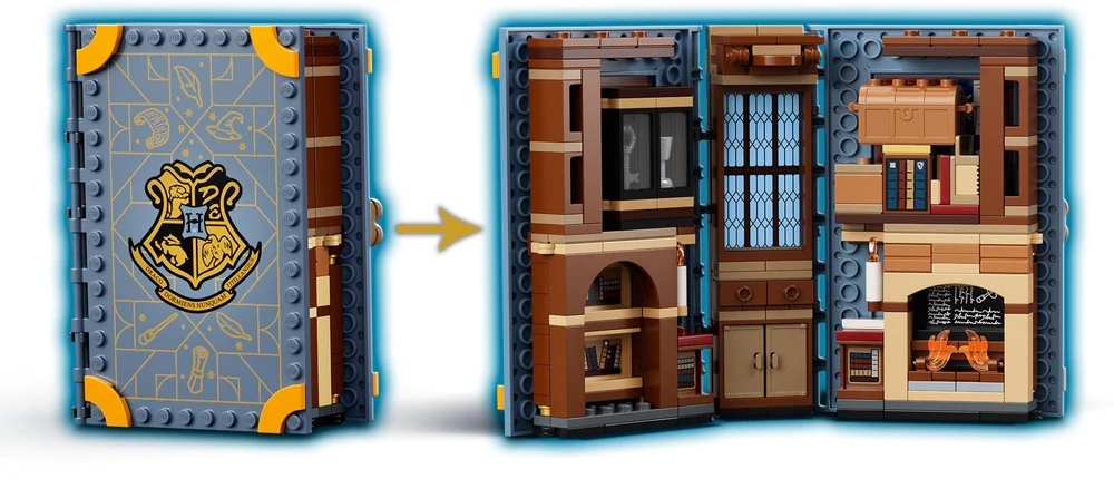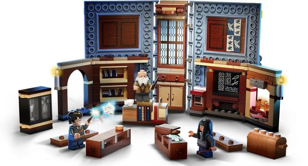 - LEGO® Harry Potter™ Hogwarts Moments™: Spells and Charms Class (76385) — книга из кубиков, в которой скрывается место, известное из фильмов о Гарри Поттере — комната, где профессор Флитвик дает урок заклинаний и чар. .