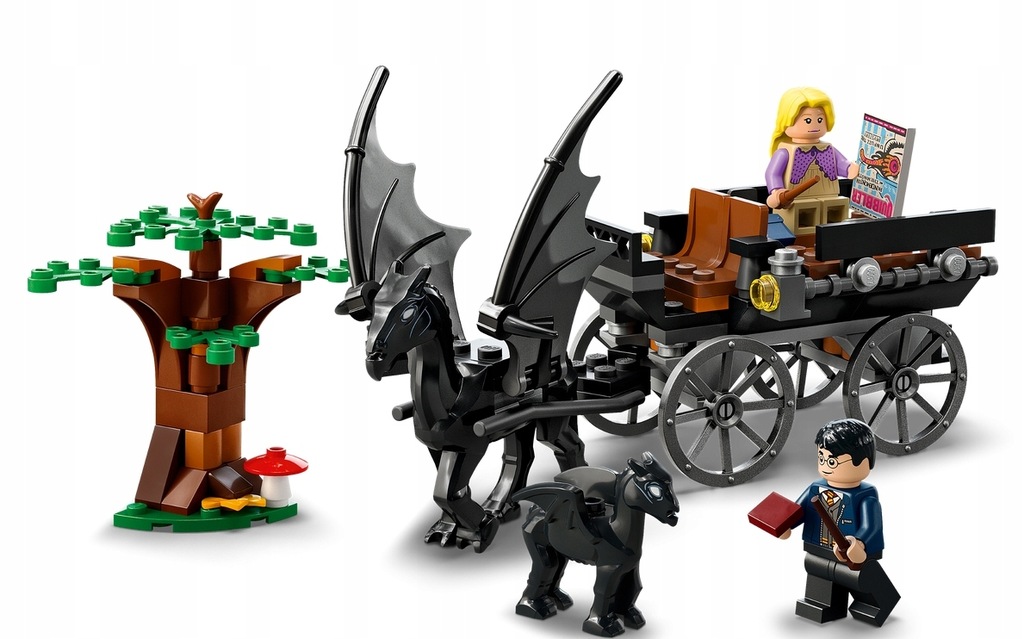 Знаменитые персонажи, в том числе минифигурки Гарри Поттера™ и Луны Лавгуд™, взрослые и дети фестральные фигурки и сборная повозка, в которую можно запрячь взрослого фестрала.