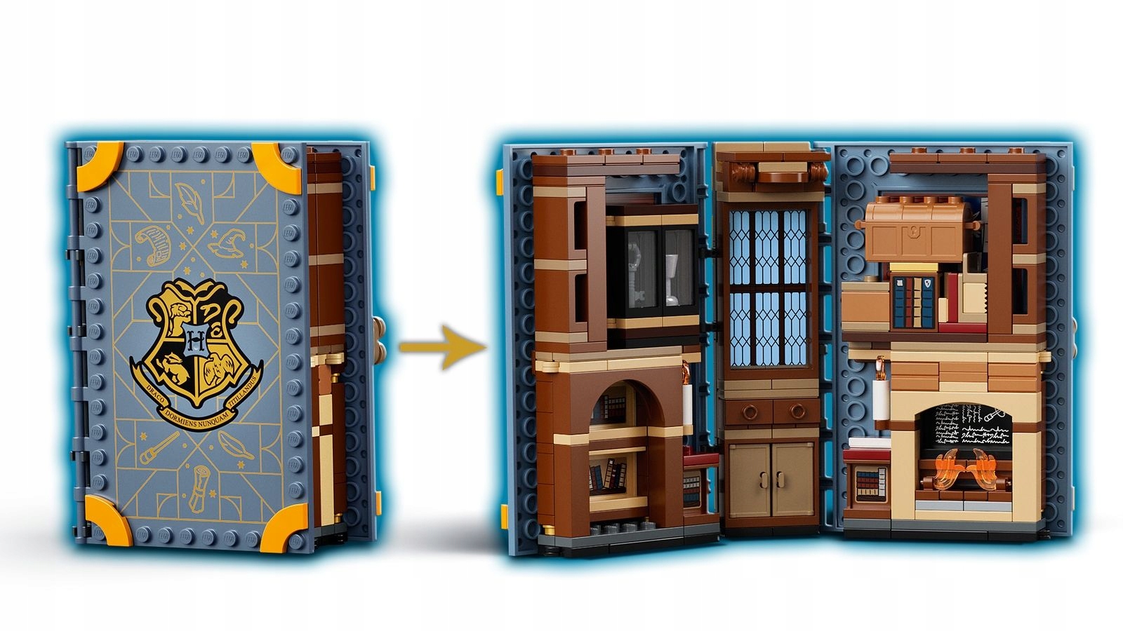- LEGO® Harry Potter™ Hogwarts Moments™: Spells and Charms Class (76385) — книга из кубиков, в которой скрывается место, известное из фильмов о Гарри Поттере — комната, где профессор Флитвик дает урок заклинаний и чар. .