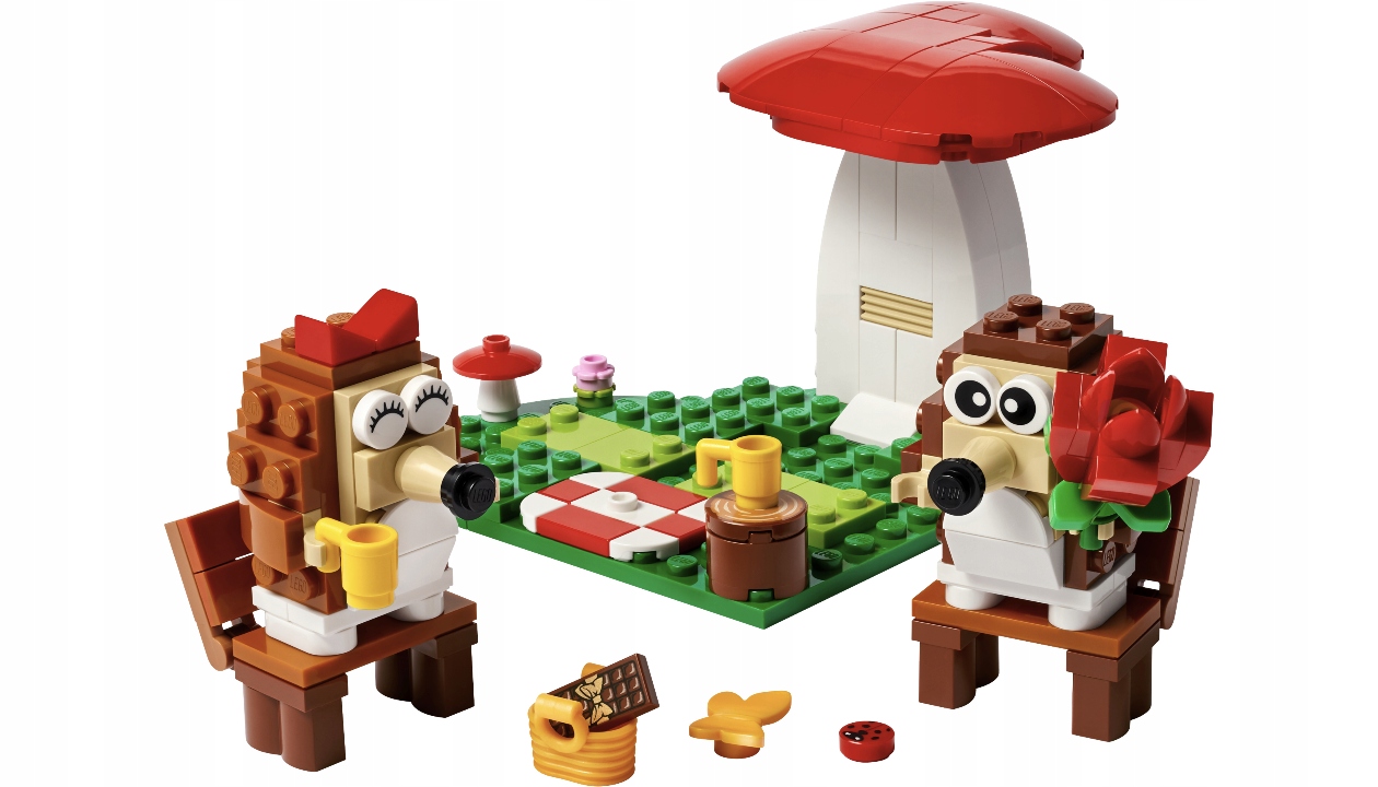 Этот красочный набор LEGO полон забавных элементов. Ежиков можно снять со скамейки и положить на плед для пикника в окружении розы, чашек, торта и желтой бабочки. Кроме того, ёжики могут держать в лапках чашки.