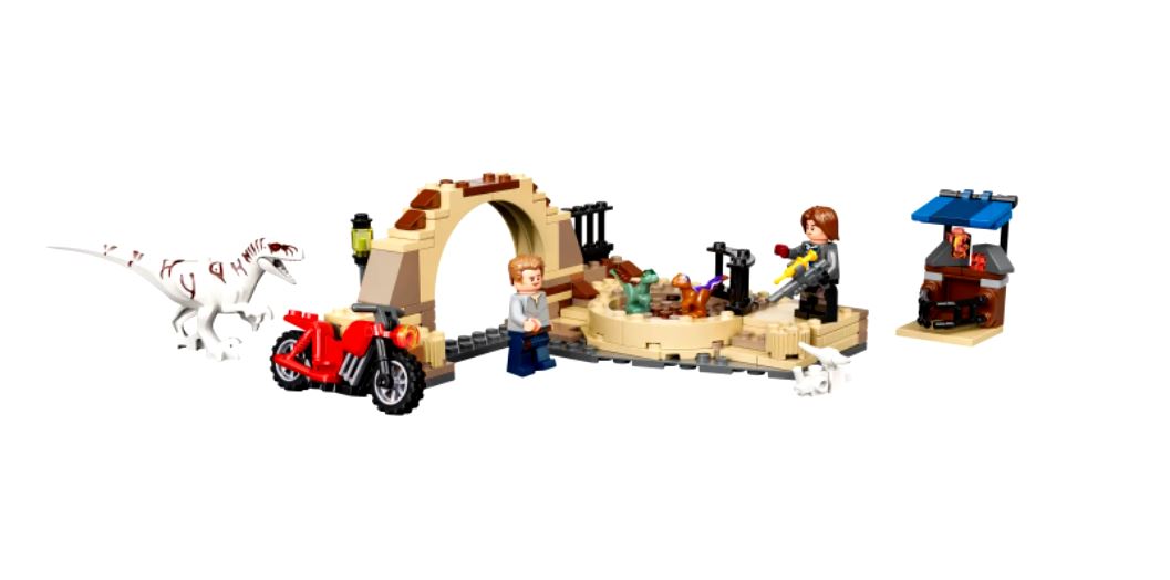 - 2 минифигурки и динозавры LEGO® — Оуэн Грейди и Рэйн Делакур с пистолетом с транквилизатором, подвижная фигурка Атроцираптора и две фигурки детенышей динозавров для ролевых игр.