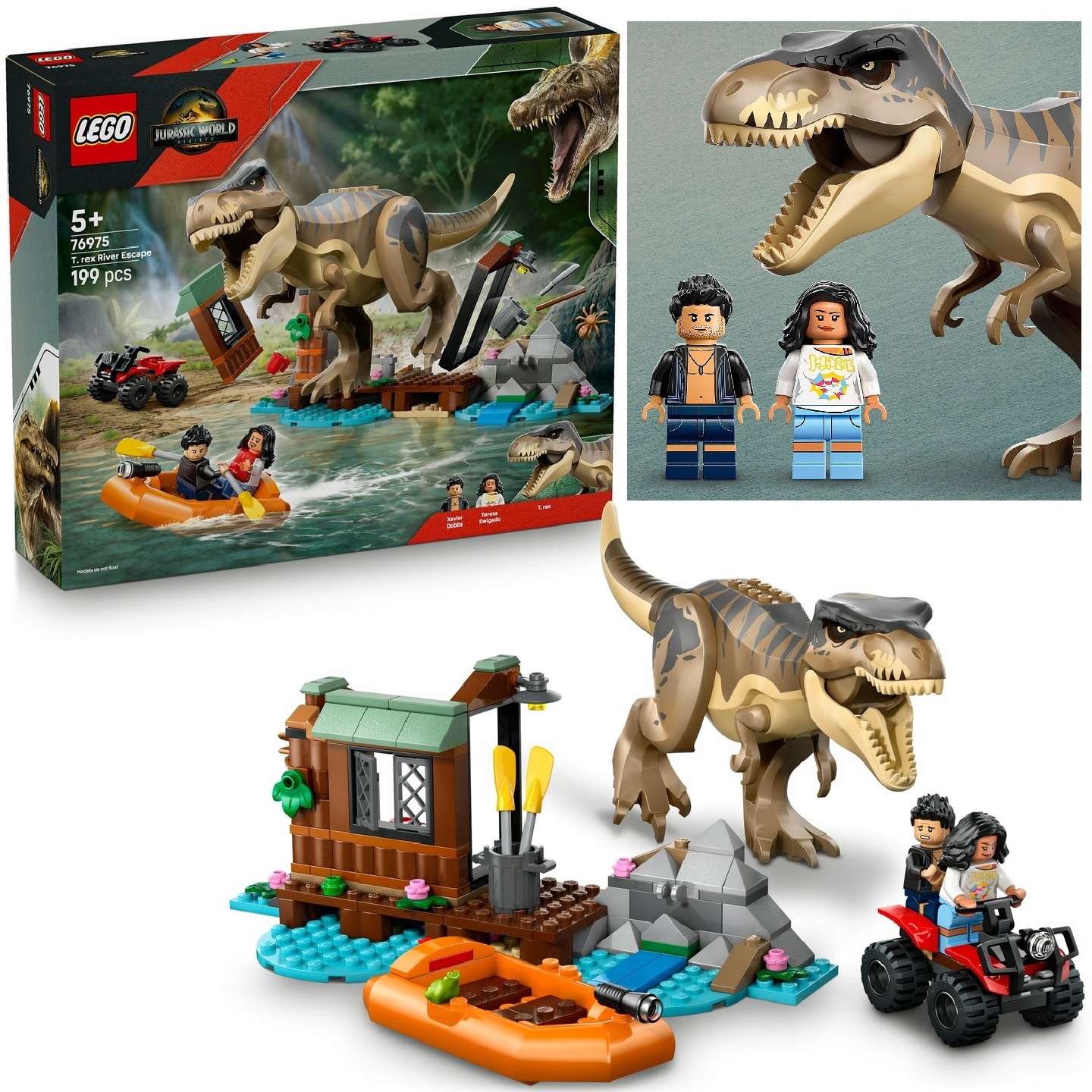 Lego Jurassic World 76975 T.Rex River Escape - это больше, чем блоки - это динамичный побег от гигантского тиранозавра! 199 -Установка с подвижным T.Rex, лодкой с бамперами, квадроциклами и более близкой хижиной гарантирует хижину. Драматические сцены спасения. Мини -фигурки Терезы Дельгадо и Ксавье Доббса возрождают сценарий, полный действия.