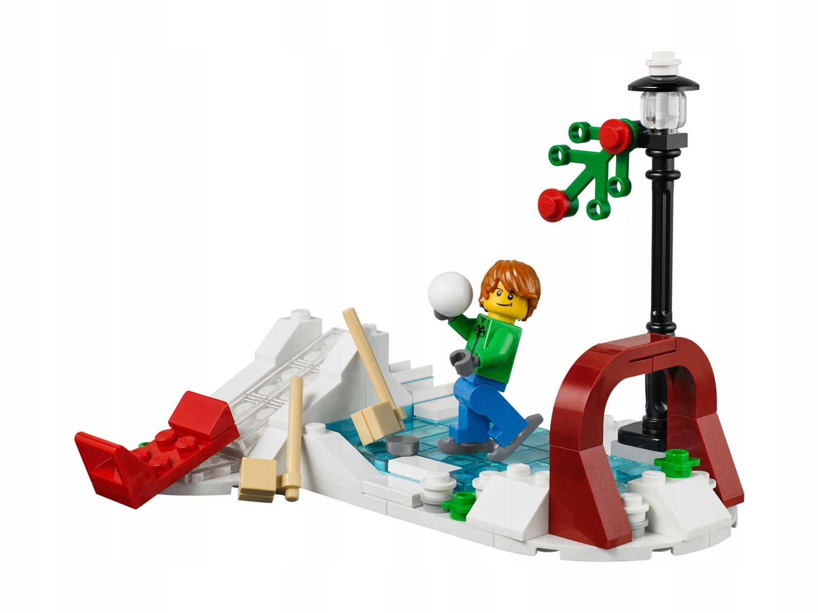 - Набор содержит элементы для сборки рождественского катка с горкой и санками, оборудование для игры на коньках хоккеиста и украшенный фонарь.