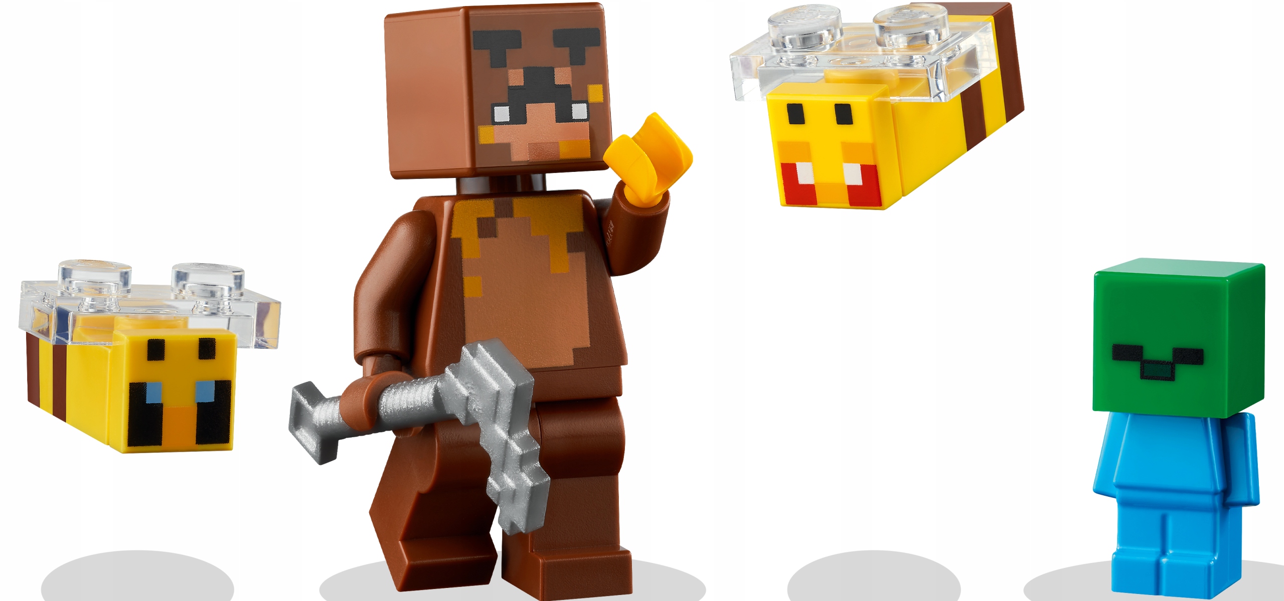Игроки могут использовать творческие навыки сборки в игре, чтобы создать дом в форме улья. Съемная крыша обеспечивает легкий доступ внутрь. Снаружи вы можете собирать соты из улья, выращивать растения и защищаться от мобов. В набор входит фигурка медведя, зомби-детеныша, три пчелы и одна злая пчела. Двух пчел можно привести в движение вокруг дерева одним щелчком пальца. Для дополнительного цифрового развлечения приложение LEGO Builder позволяет масштабировать и вращать модель во время сборки.
