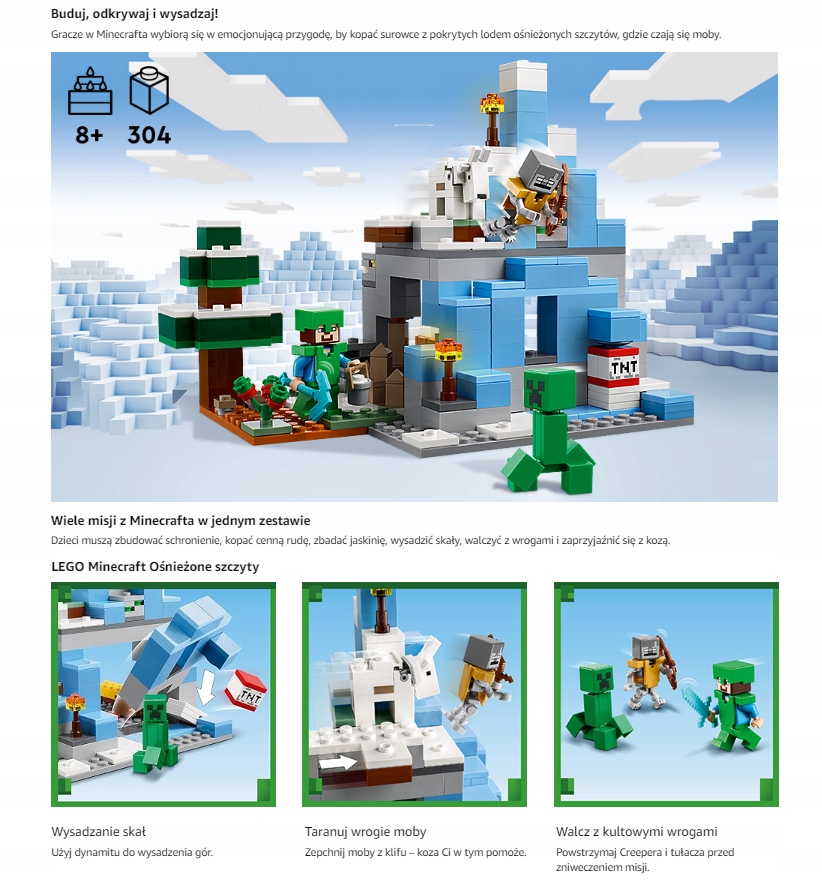 Набор LEGO® Minecraft Snowy Peaks — это не только сборная модель, но и ворота в удивительные приключения в заснеженных горах Minecraft. Набор с реалистичными деталями и интерактивными функциями вдохновляет на творческую игру и воображение.