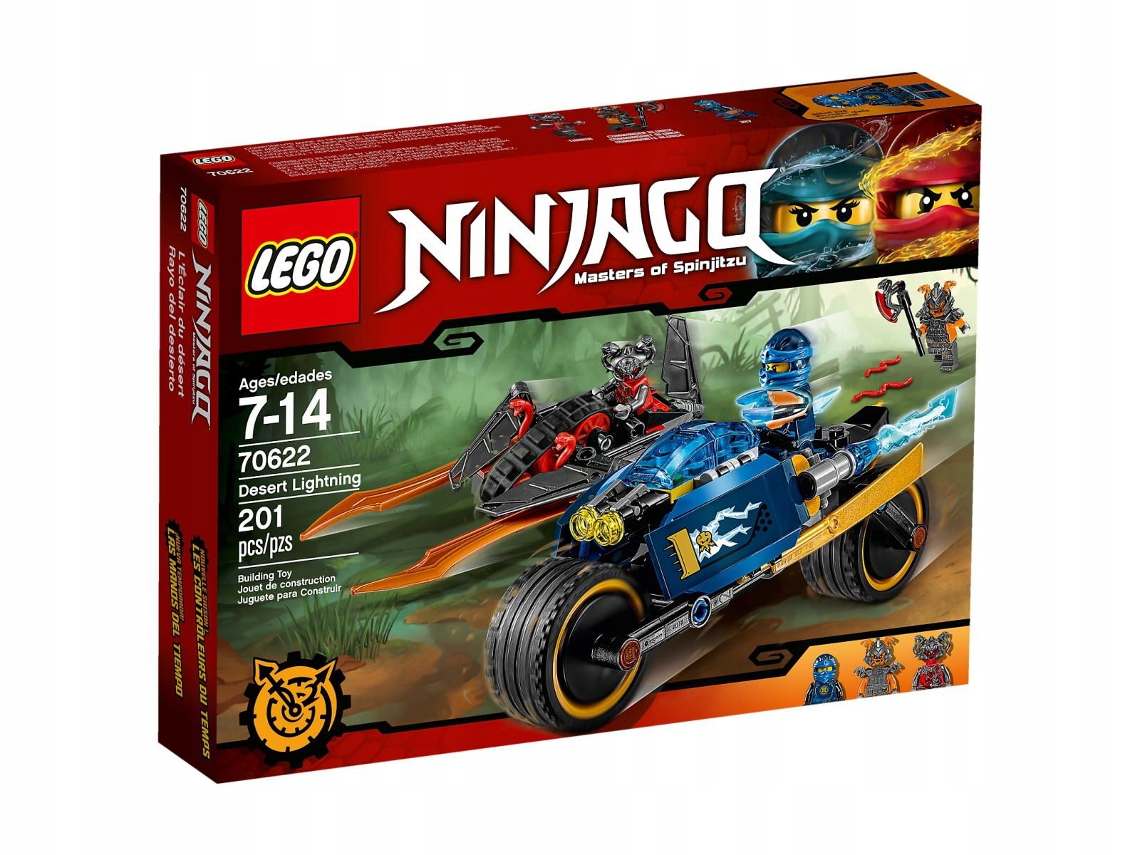 - В Desert Lightning есть место для сидения минифигурки, большие колеса и полупрозрачные световые элементы, которые стреляют. шипы , раскладной усилитель молний и лезвия ниндзя золотого цвета.