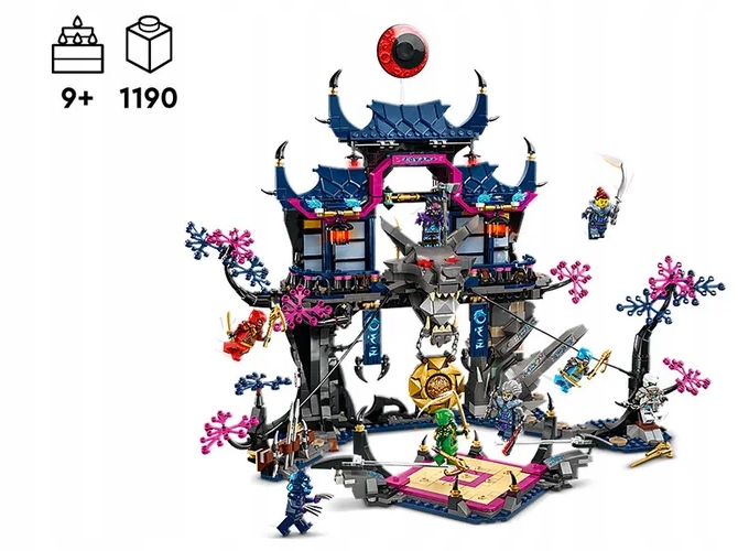 Игровой набор «Теневое додзё Волчьей маски» включает в себя игровую зону поля боя, скрытые ловушки и 8 минифигурок персонажей NINJAGO®.