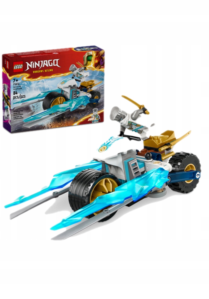 LEGO NINJAGO ICE MOTOCYCLE ZANE 71816 -Набор LEGO® Ninjago® LODA Zane Motorcycle (71816) позволяет семилетним и старшим детям играть динамические сцены со второго сезона серии Ninjago®: будут созданы драконы. Он включает в себя мотоцикл ниндзяго с подвижными колесами, золотыми лезвиями и задней подвеской. После нажатия шины с обеих сторон появляются ледяные лезвия.