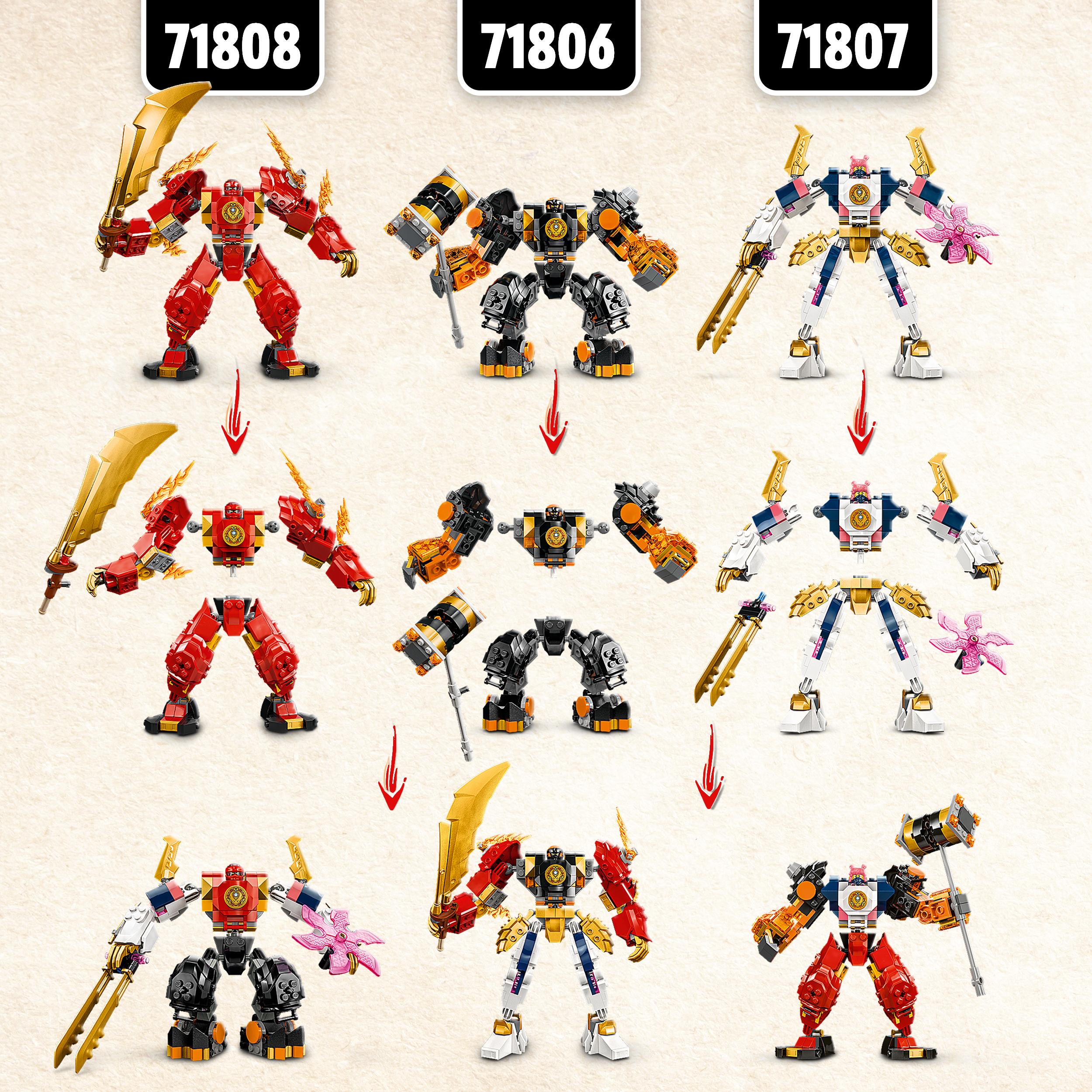 Реконструируемый мех позволяет детям собрать собственного робота! Его съемные ноги, руки и туловище можно комбинировать с частями двух других мехов: робота элементаля земли Коула (71806) и механизма элементаля технологии Соры (71807) (продаются отдельно). Смешивая и сопоставляя детали, дети могут часами веселиться, создавая уникальную фигурку.