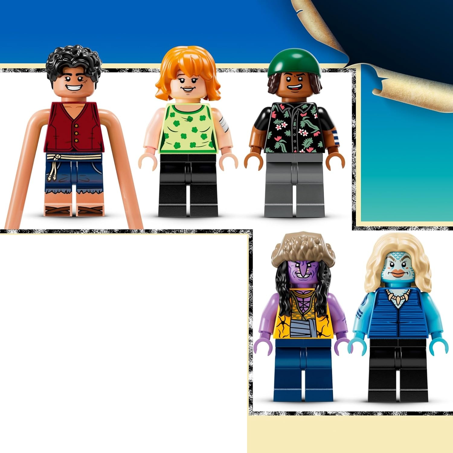 - Минифигурки LEGO® из аниме-сериала — включают минифигурки Луффи (с выдвижными руками), Нами, Усопа, Арлонга и Чу.