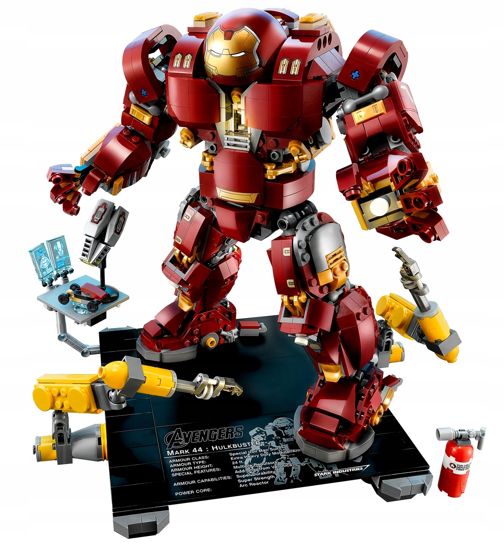 Эта детальная версия робота Халкбастера из кубиков LEGO® идеально подходит для сборки и демонстрации. Модель имеет вращающийся туловище, подвижные пальцы, руки, ноги и ступни, а также светящиеся в темноте элементы. Выберите одну из двух сменных рук (включая отбойный молоток с функцией бокса), а затем активируйте светящийся кирпич LEGO в груди робота. В комплект LEGO® Marvel Super Heroes Hulkbuster: Ultron Edition также входит демонстрационная платформа с различными точками крепления для подвижных роботизированных строительных стрел, стол и новейшая минифигурка Железного Человека Марка 43.