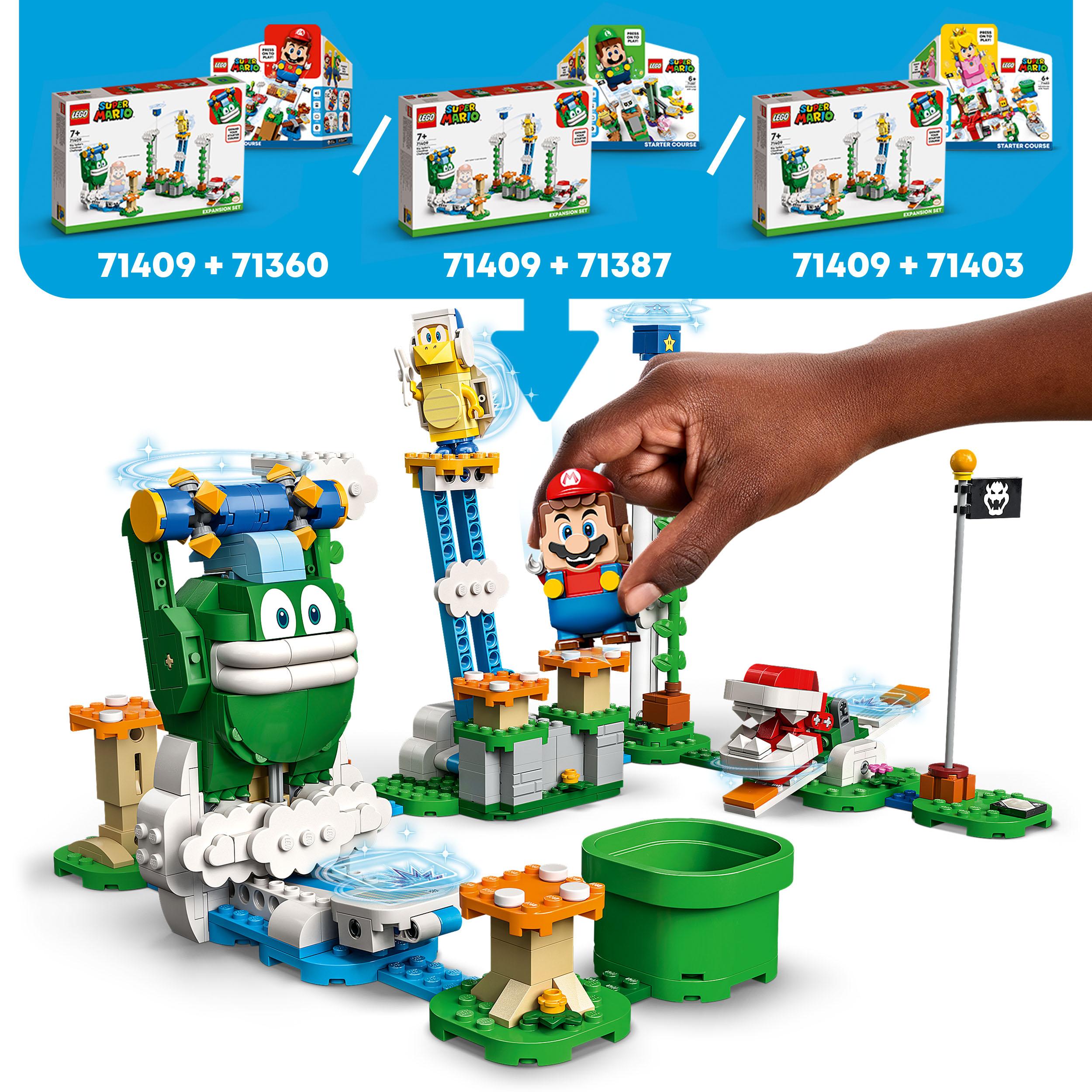 С набором расширения «Большой шип и облака» (71409) дети смогут смогут построить свой собственный небесный уровень LEGO® Super Mario™. В набор входит испытание из игр Super Mario™ и фигурки LEGO трех популярных врагов — Большого Спайка, Бро-бумеранга и Растения-пираньи. Игроки зарабатывают цифровые монеты, помогая LEGO® Mario™, LEGO® Luigi™ или LEGO® Peach™ (фигурки не включены) в битве против Большого Спайка. Они также могут прыгать на батутах с оранжевыми грибами, чтобы победить Бро Бумеранга, использовать звездный блок и многое другое.