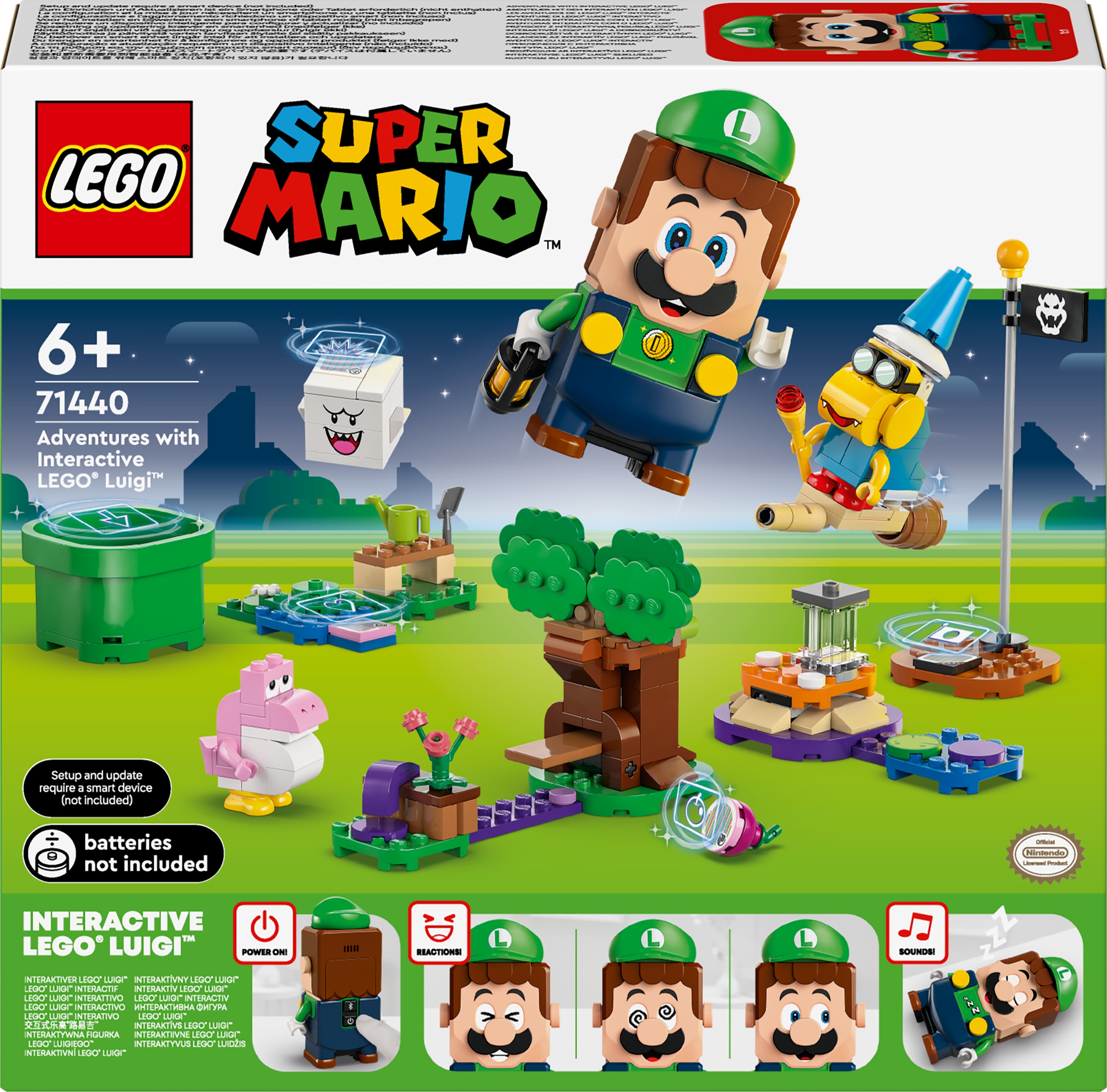 Приключения Super Mario™ с интерактивной фигуркой LEGO® Luigi™ Приключения LEGO® Super Mario™ с интерактивной фигуркой LEGO® Luigi™ Приключения LEGO® Super Mario™ с интерактивной фигуркой LEGO® Luigi™ С этим набором фигурок LEGO® Luigi™, Дети сможете часами интерактивно веселиться с Камеком, Бу и розовым малышом Йоши. Набор персонажей Nintendo® для интерактивной игры Наслаждайтесь веселыми приключениями в саду с интерактивной фигуркой LEGO® Luigi™ LEGO® Super Mario™ (71440). Этот великолепный подарок на тему Nintendo® для мальчиков, девочек и геймеров от шести лет и старше включает в себя интерактивную фигурку Луиджи LEGO, а также Камека, розового Малыша Йоши и Бу. Перемещайтесь от стартового столба к финишному, используя три модели в саду, запуская цифровые реакции Луиджи LEGO и собирая по пути монеты. Поздоровайтесь с розовым Малышом Йоши и соберите несколько инструментов. Победите Бу, прячущегося на дереве, и «съешьте» плод. Помогите фигурке Луиджи LEGO® выяснить, кто распространяет яд в саду! Поздоровайтесь с розовым Малышом Йоши, возьмите фонарь и начните исследовать сад. Победите Бу, прячущегося на дереве, и съешьте плод. Смотреть! Весь этот ущерб причиняет Камек своей ядовитой магией. • Приключения с интерактивной фигуркой LEGO® Luigi™: объедините усилия с LEGO Luigi, чтобы выяснить, кто отравляет сад, играя с набором LEGO® Super Mario™. • Четыре фигурки LEGO® Super Mario™ — этот коллекционный набор Nintendo®. включает интерактивную фигурку Луиджи LEGO®, а также Камека, розового малыша Йоши и Бу • Игровой набор «Сад» — начните со стартовой трубы, поздоровайтесь с розовым малышом Йоши и возьмите фонарь.