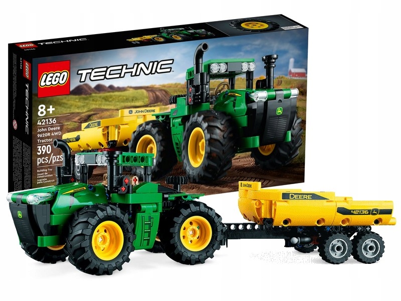 Детям от 8 лет и старше, увлекающимся игрушечными тракторами, понравится конструктор LEGO® Technic John Deere 9620R 4WD Tractor (42136). Трактор и прицеп, разработанные в сотрудничестве с John Deere, обладают множеством реалистичных особенностей. Он оснащен огромными колесами, шарнирно-сочлененным рулевым управлением и кабиной водителя с вращающимся сиденьем.