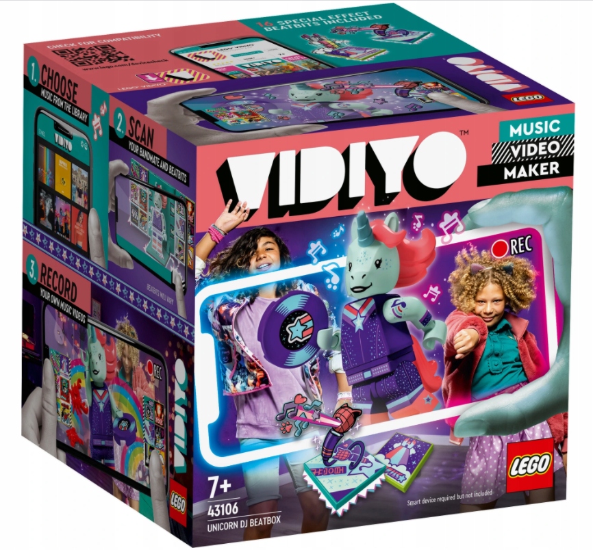 Пусть дети, которые любят танцевать и выступать, перенесутся в мир музыкальных клипов. Набор LEGO® VIDIYO™ Unicorn DJ BeatBox (43106) внесет разнообразие в любые игры. Загрузите бесплатное приложение, отсканируйте фигурку музыкального исполнителя и увидите сценический образ диджея-единорога. Вы также можете сканировать BeatBits, чтобы разблокировать специальные эффекты, испытания и многое другое. С помощью этого набора дети смогут создавать свои собственные музыкальные клипы и делиться ими с другими авторами в безопасной среде. Веселье где угодно Детям понравится украшать модель BeatBox кубиками LEGO. Они могут использовать единорога, диджейскую консоль и радужные облака или создать свои собственные декорации. В складной BeatBox можно положить BeatBits и минифигурку, что делает его идеальным для путешествий. Создавайте свои собственные музыкальные клипы. С наборами LEGO VIDIYO дети могут выступать в роли режиссеров, продюсеров и звезд своих собственных музыкальных клипов, развлекаясь безопасно. Позвольте им расширить свои творческие способности, записывая музыкальные клипы, наполненные музыкой, интересными персонажами, песнями, танцевальными движениями и потрясающими эффектами.