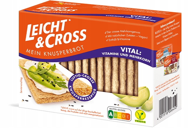 Легкий и дышащий хрустящий хлеб Leicht & Cross Vital содержит много витаминов B и производились без усилителей вкуса. Эйрный и хрустящий рецепт делает хрустящее хлеб абсолютно, будь то обычные, сладкие или соленые добавки, и имеет непревзойденный натуральный вкус