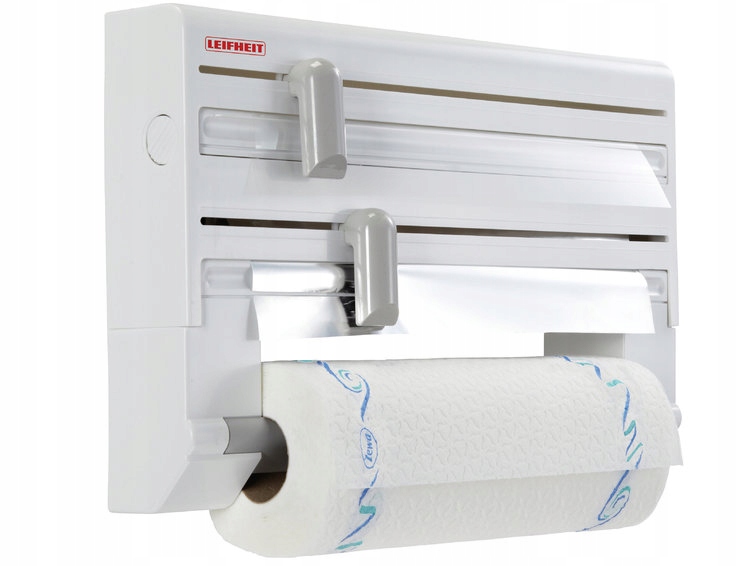 Настенный диспенсер для фольги и бумаги LEIFHEIT PARATДиспенсер для фольги и бумаги Leifheit Parat сделает работу на кухне намного удобнее, а аксессуары, необходимые для упаковки пищевых продуктов, всегда будут у вас под рукой. Данная модель изготовлена из качественного пластика белого цвета. Его дополняют серые элементы, например, держатели ножей для резки фольги, защищающие руки от порезов. Устройство подачи вмещает два рулона алюминиевой или пищевой фольги и один рулон бумажных полотенец. Замена их очень проста и не занимает много времени. Просто снимите корпус Parat, замените ролики и замените крышку. Размеры устройства подачи фольги и бумаги Leifheit Parat составляют 26,5 см в высоту, 41,5 см в ширину и 9,5 см в глубину. Острые ножи гарантируют точную обрезку фольги. Вы можете забыть о рваных и неровных фрагментах. После каждой резки кусок фольги остается снаружи кормушки, поэтому его удобно растягивать на нужную длину. Модель Парат предназначена для всех стандартных рулонов фольги и бумажных полотенец. Его установка на стену очень проста. Гарантия на кормушку составляет 3 года. В него помещаются два рулона алюминиевой или пищевой фольги и один рулон бумажных полотенец. Острые ножи для очень точной резки. Концы фольги всегда немного выступают из кормушки. Легкая замена рулонов. Гарантия 3 года.
