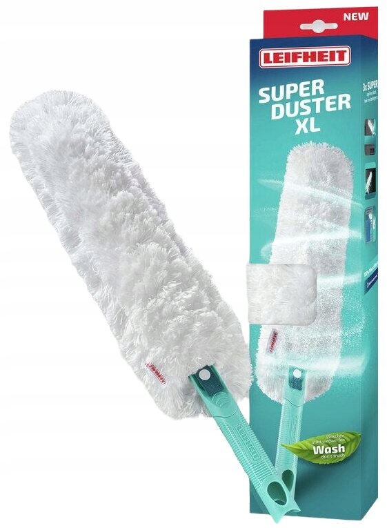 Экологичный, эффективный и надежный продукт: с тряпкой SUPERDUSTER XL от Leifheit удаление пыли происходит молниеносно. Удлиненная тряпка изготовлена из высококачественного текстильного материала. Благодаря практичной застежке-кнопке его можно легко снять с держателя и постирать. Чехол-пылесборник можно стирать в стиральной машине при температуре 40°C до 50 раз — экологически чистое решение, которое не только сокращает количество отходов, но и экономит деньги, поскольку использование одноразовых изделий больше не требуется. Несмотря на частую стирку, многоразовая тряпка остается работоспособной и эффективной. После стирки чехла просто встряхните его и высушите, чтобы вернуть себе гибкую и пушистую форму. После надевания чехла устройство сразу же снова готово к использованию и впечатляет превосходной эффективностью очистки. Благодаря размеру XL и ткани из микрофибры, вращающейся на 360°, тряпка SUPERDUSTER XL надежно собирает пыль, волосы и аллергены даже с больших и труднодоступных поверхностей. Пыль и грязь эффективно удерживаются в волокнах, поэтому не всплывают в воздухе и не разносятся по помещению. Пылесос, оснащенный широкой и узкой стороной, подходит для уборки больших поверхностей, а также небольших углов и углублений. Эргономичная ручка, изготовленная из переработанного пластика, идеально лежит в руке и обеспечивает комфорт при чистке. Он также выделяется с точки зрения устойчивости. Особенно умное решение: тряпка SUPERDUSTER XL со сменной насадкой совместима с системой Leifheit Click. Благодаря этому вы легко сможете подключить соответствующие ручки – идеальное решение для удобной и безопасной уборки высоких мест, например, шкафов или полок, без необходимости использования табурета или лестницы.