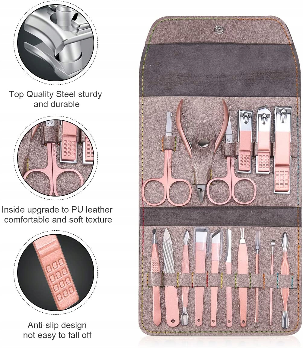 Маникюрный набор Leipple, профессиональные наборы для стрижки ногтей, набор для педикюра — 16 предметов. Набор для ухода за ногтями из нержавеющей стали — инструменты для ухода за ногтями в роскошном кожаном дорожном футляре (серебристо-серый)