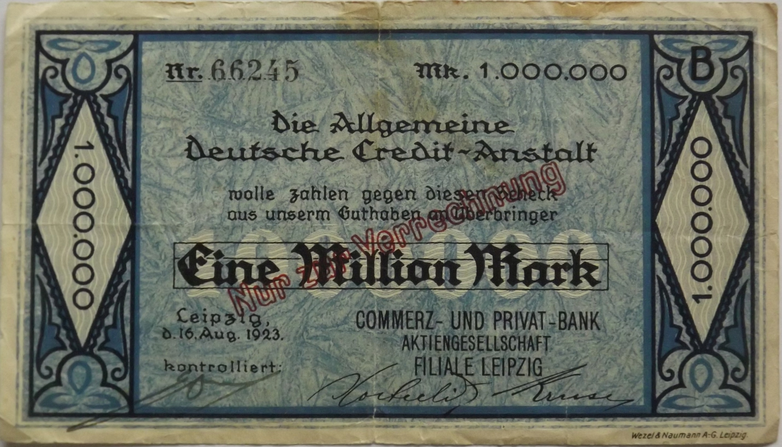 Лейпциг, 16 августа 1923 года, банкнота номиналом 1 миллион марок класса 3-/4+
