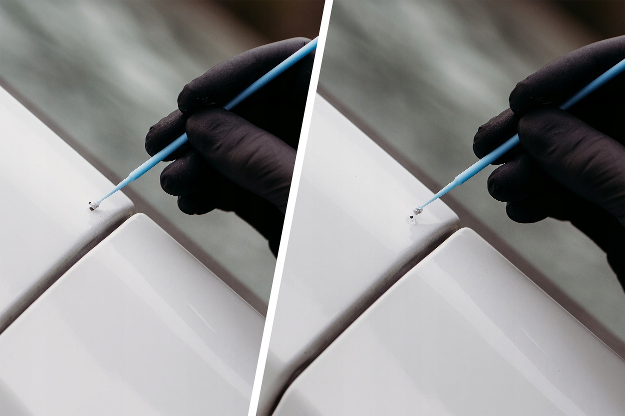 5⃣ Нанесите один или два тонких слоя, используя щетку, покрывая ремонтированную область.