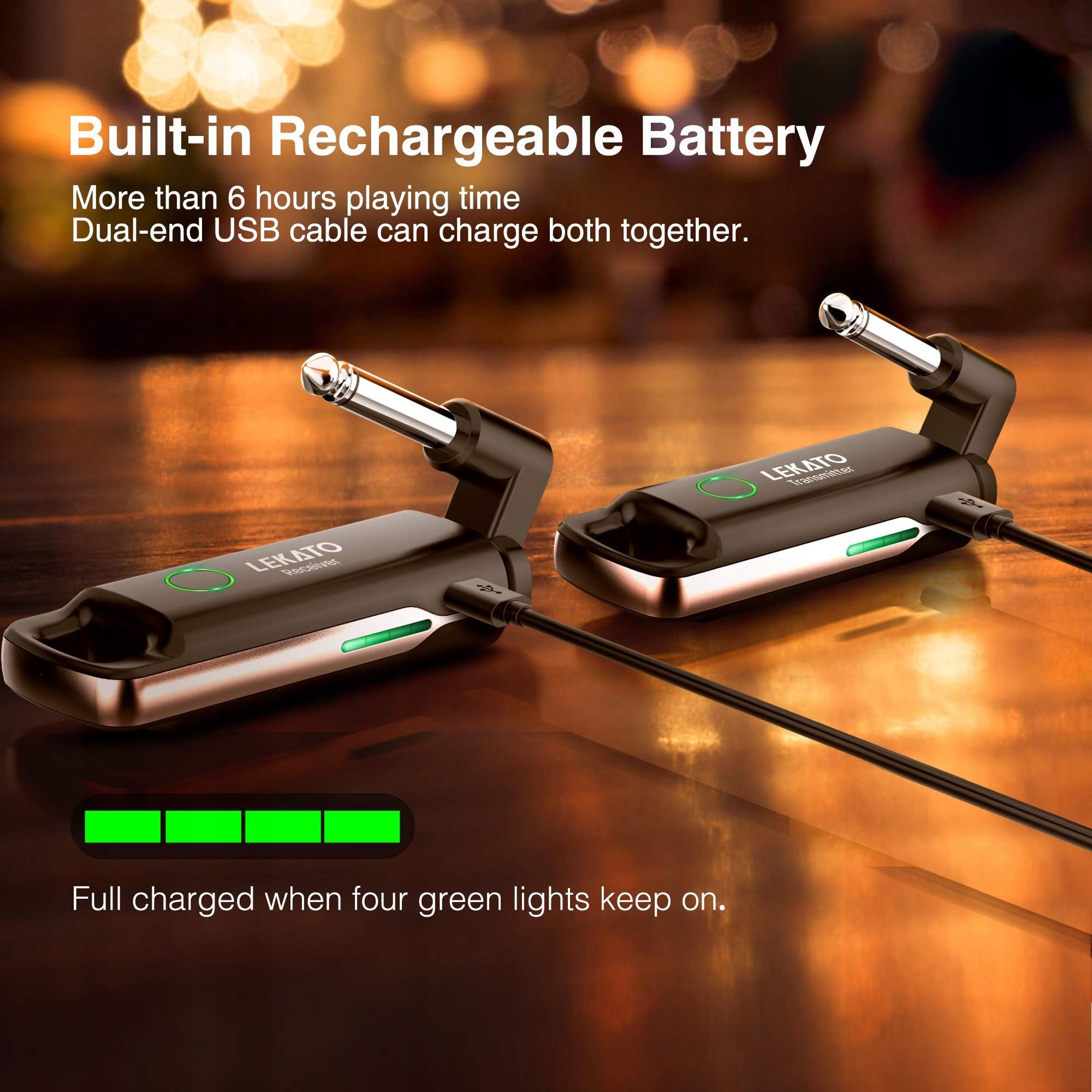 Встроенный литий-ионный аккумулятор обеспечивает более 6 часов непрерывной работы при полной зарядке, что идеально подходит для длительных концертов и сессий записи. Входящий в комплект двусторонний USB-кабель позволяет удобно заряжать передатчик и приемник одновременно. Простая зарядка гарантирует, что ваша система будет готова к любому выступлению, а вы сможете сосредоточиться исключительно на музыке.