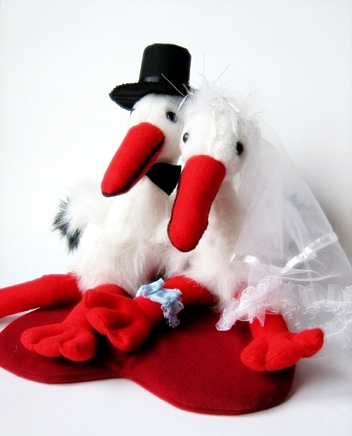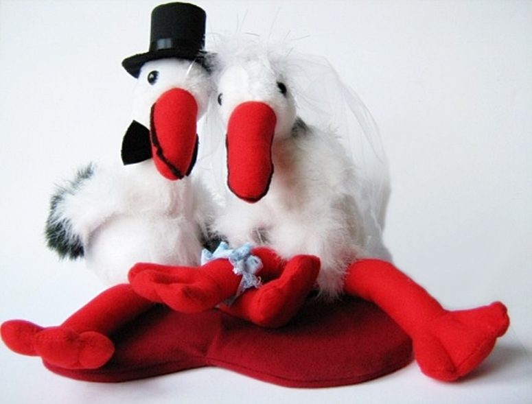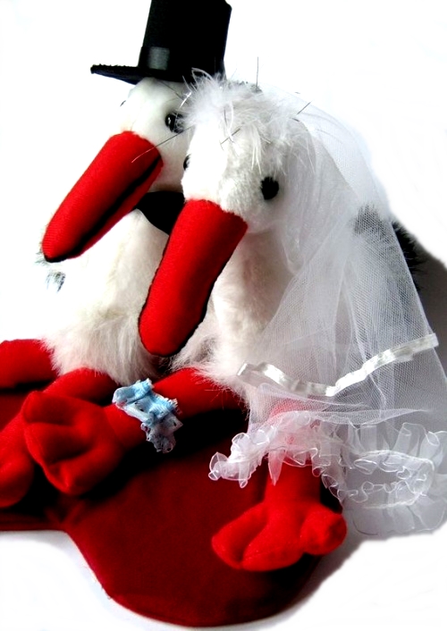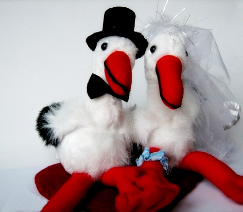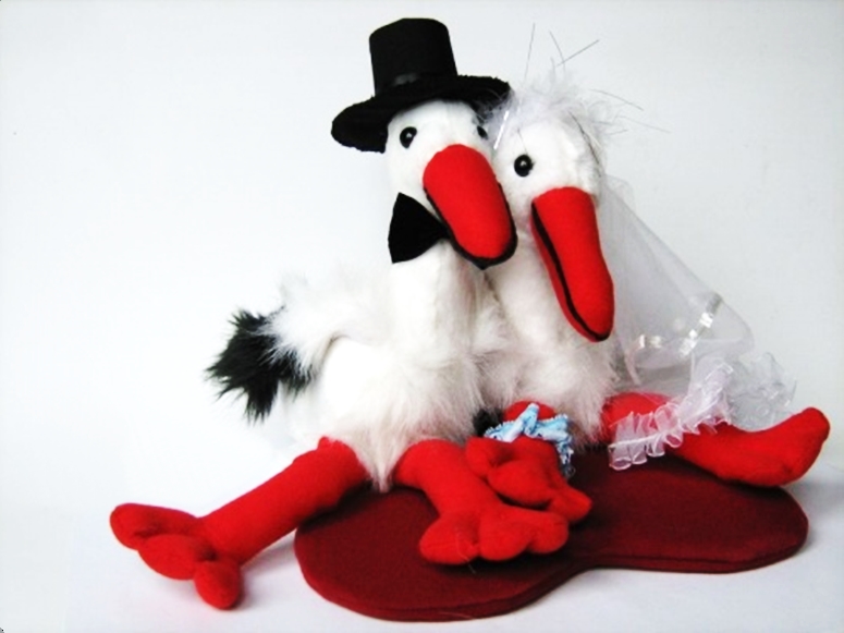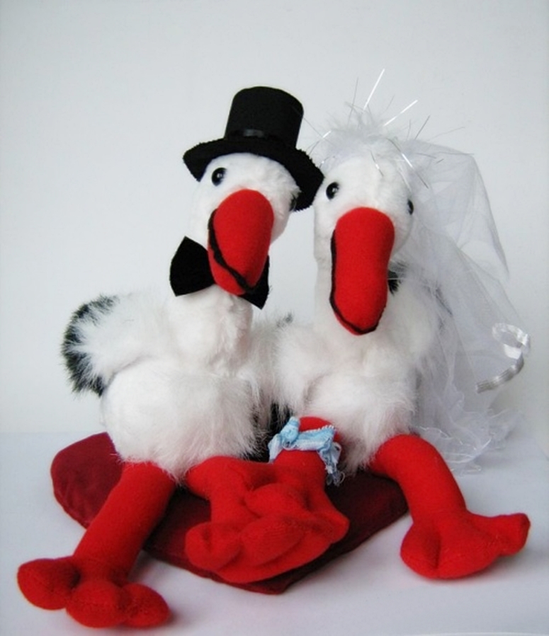 Молодая пара аистов может стать прекрасным подарком в плетеной корзине или украсить стену или стол в свадебном доме.