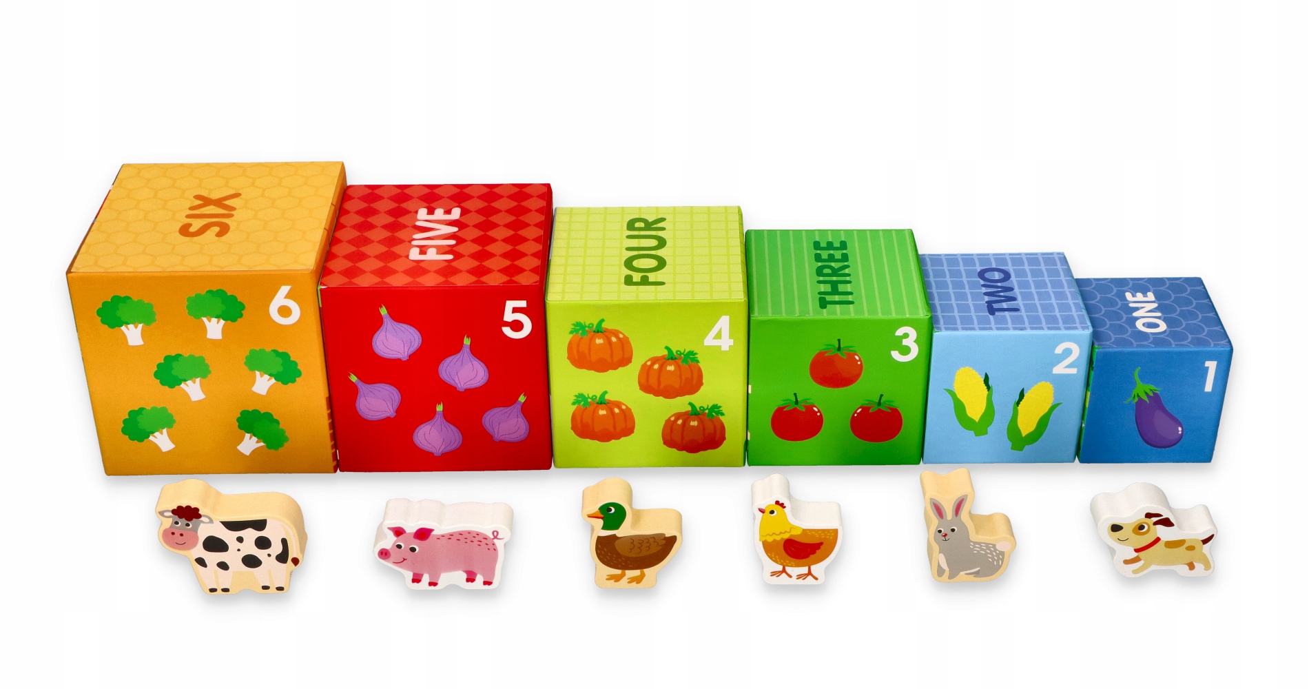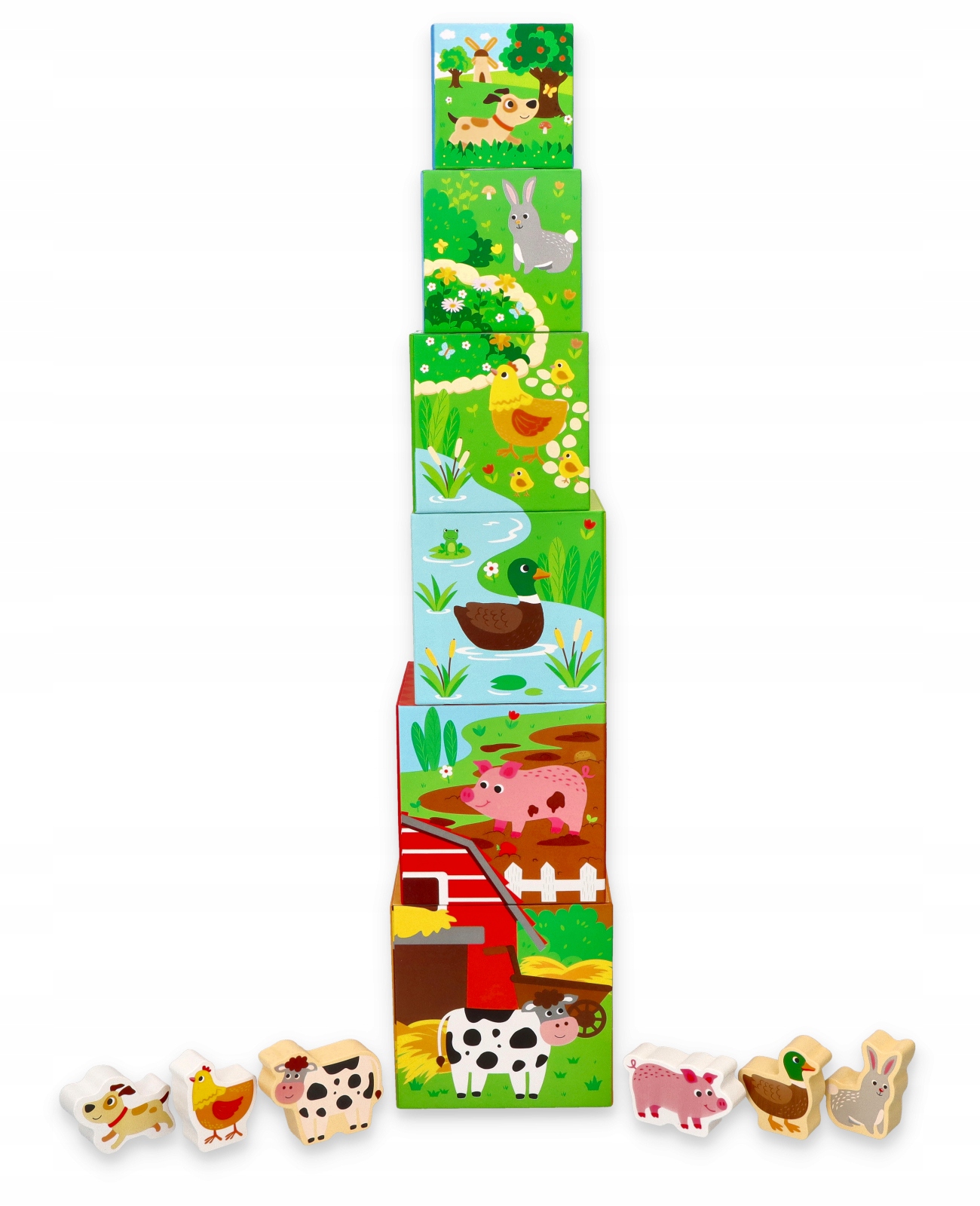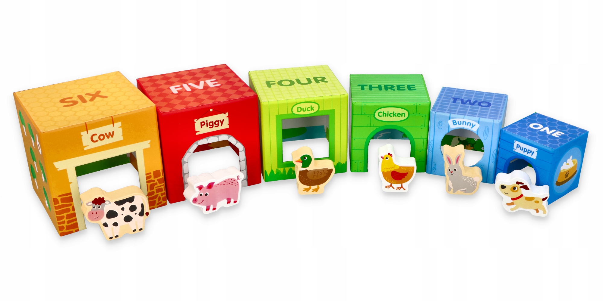 В набор входят 6 картонных стаканчиков-домиков и 6 деревянных фигурок животных: собачка, зайка, лисички, уточки, поросёнки и коровка.