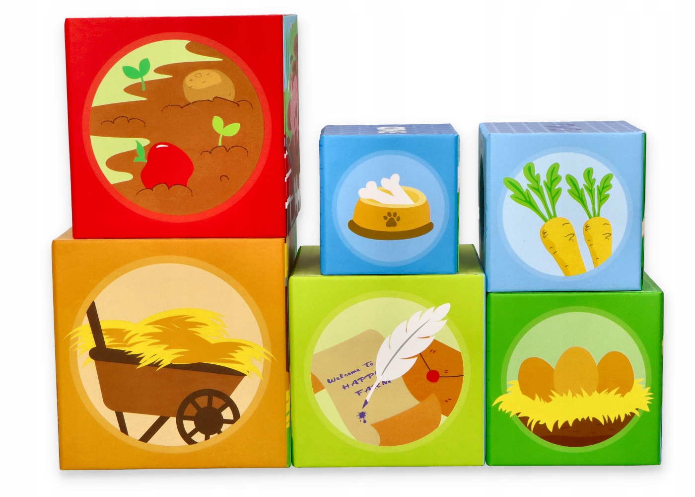 - На последней стороне размещена картинка с животным, подходящим для данного дома, но путем расположения кубиков в пирамидка, эти отдельные картинки составят одно большое целое, изображающее жизнь на ферме.