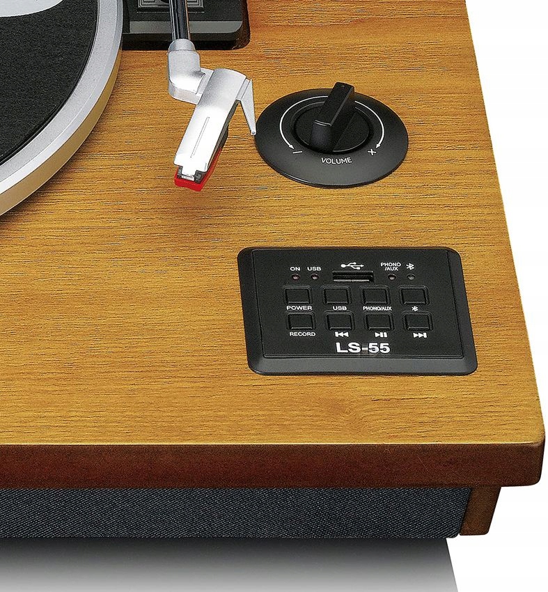 LS-55 — красивый деревянный проигрыватель со встроенными стереодинамиками.