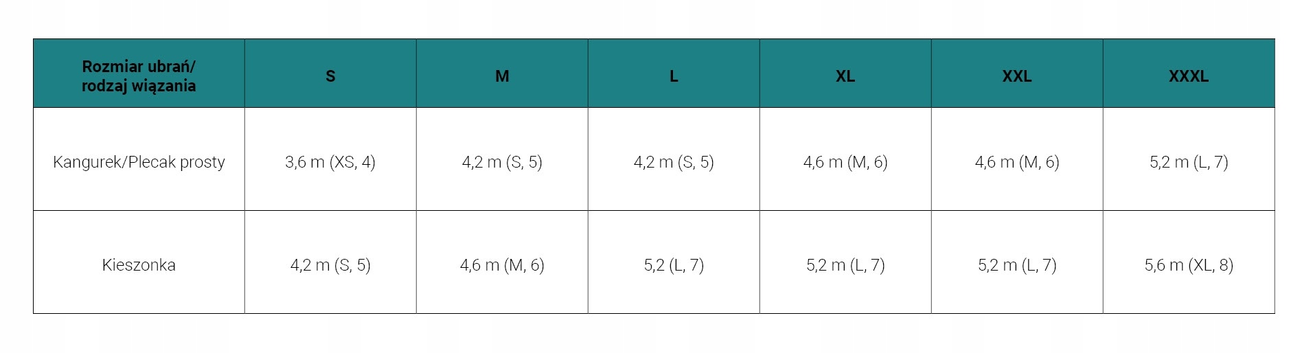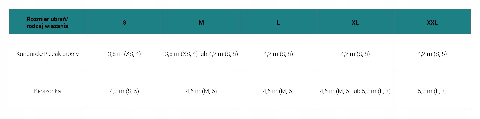 В таблицах ниже я показываю, какова взаимосвязь между типом привязки, строительством родителя и длиной платка. Когда мы хотим носить ребенка в 2 разных измерениях, мы принимаем во внимание большего человека.