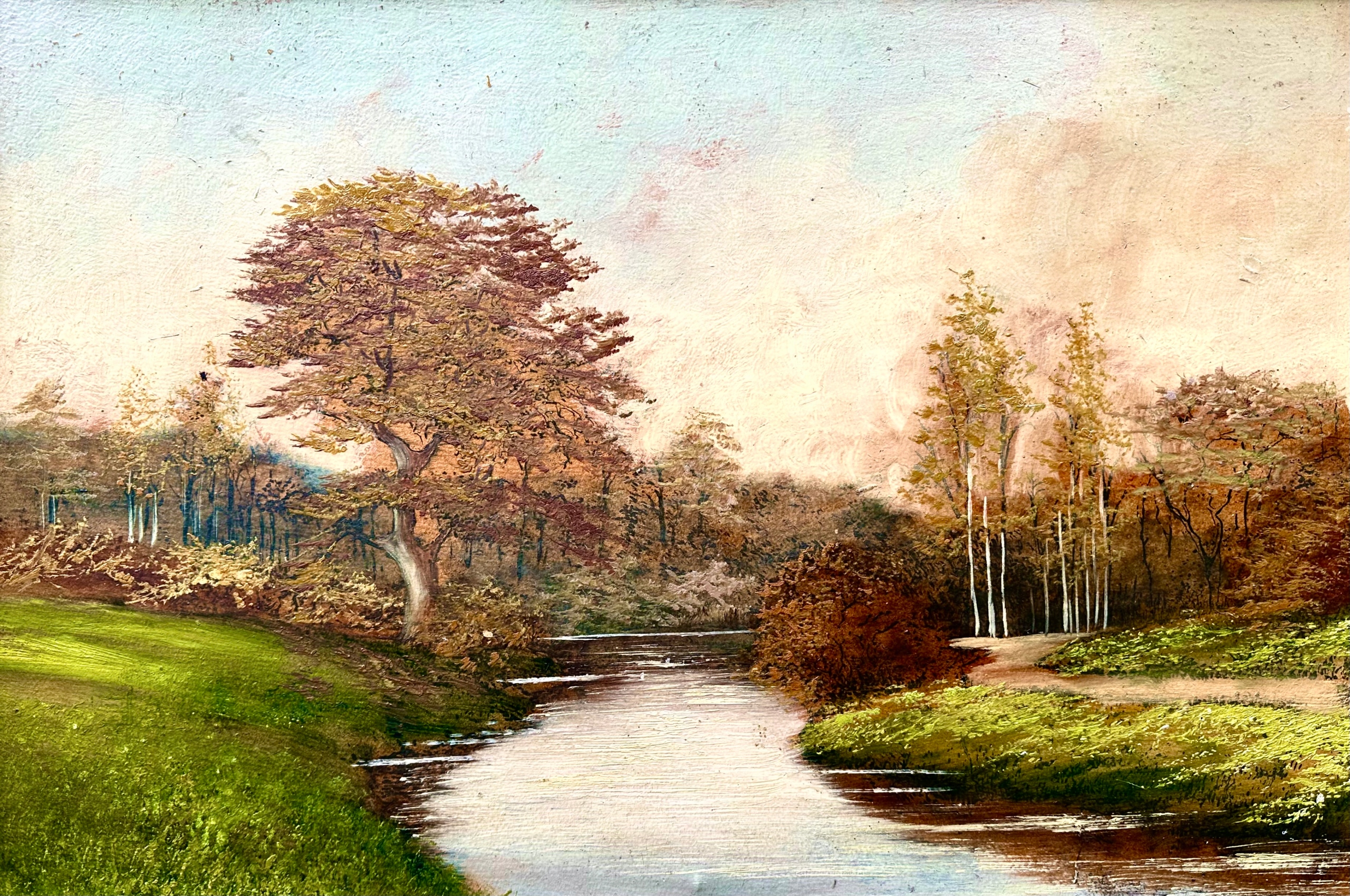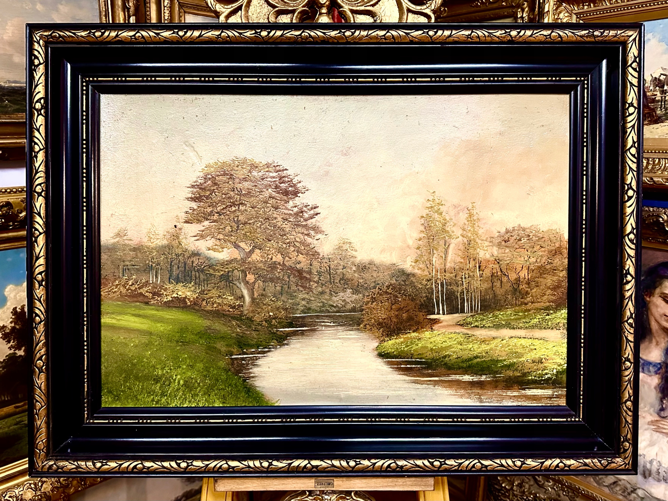 LEŚNY JESIENNY KRAJOBRAZ Z RZEKĄ POŚRÓD DRZEW BARDZO STARY PIĘKNY OBRAZ