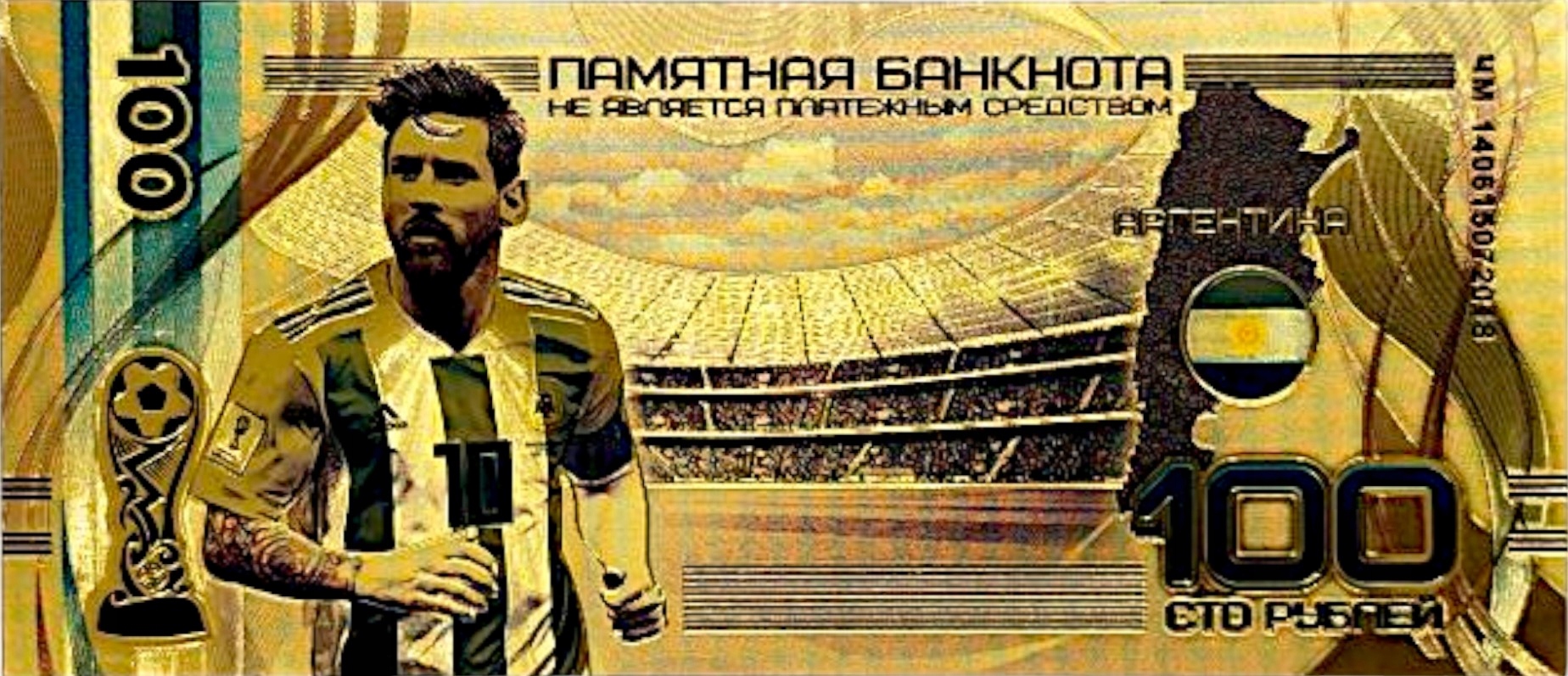 Если вы фанат футбола, коллекционируете сувениры, связанные с величайшими спортсменами мира, или просто ищете оригинальный подарок – эта позолоченная банкнота с Лео Месси с чемпионата мира по футболу 2018 года – настоящий хит!