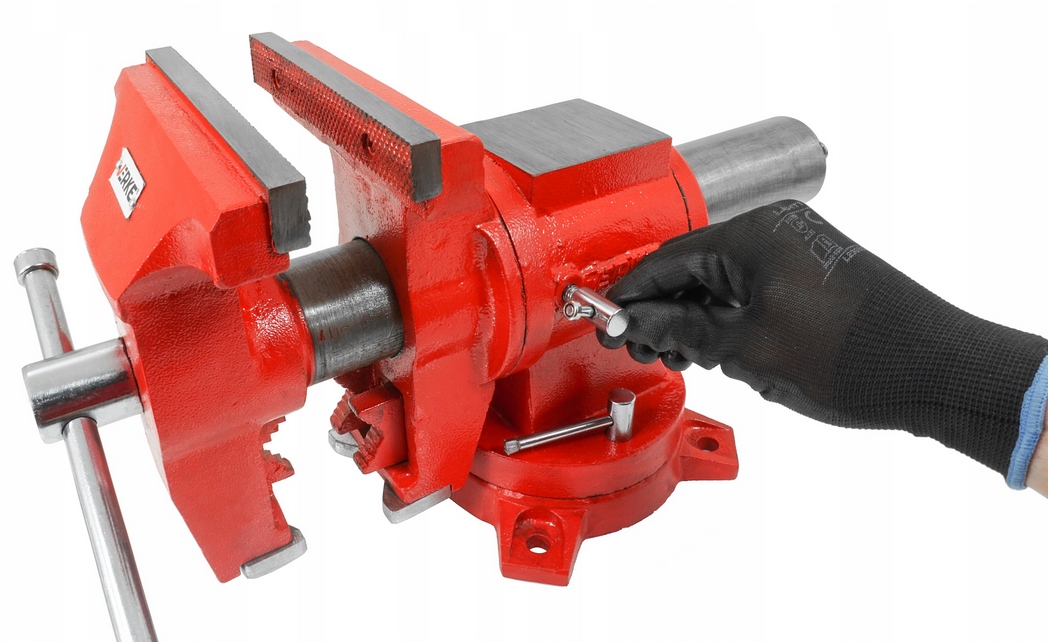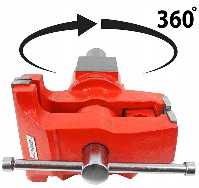 Основа вращается в диапазоне 360°, что позволяет изменять угол в горизонтальной плоскости. Тиски, соединенные с наковальней, создают прочную компактную конструкцию.
