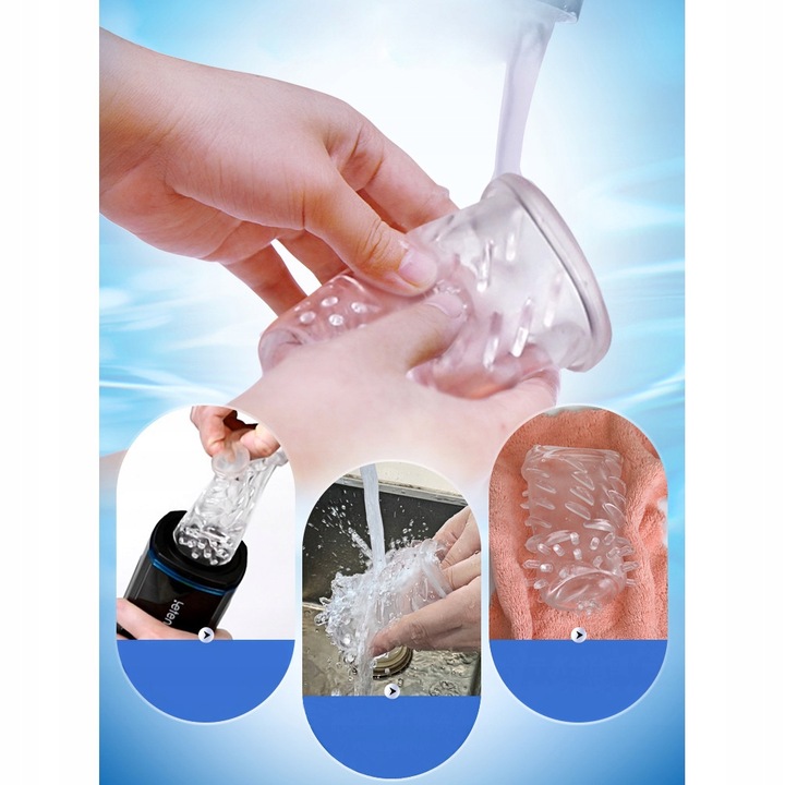 Силиконовая вставка имеет сотни крошечных язычков, которые массируют половой член, после игры вставку следует вынуть из устройства и промыть под проточной теплой водой с мылом, только после он полностью высох, можно ли снова установить вставку в устройство. В комплект входит аксессуар «палка», который облегчит установку вставки на место, не повредив ее.