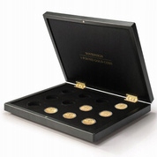 Кассета Leuchtturm - Volterra 12 x Gold Sovereign — уникальное изделие, предназначенное для хранения 12 золотых монет серии Sovereign массой 1 фунт золота в пластиковых колпачках. На обложке и на внутренней части кассеты размещена золотая надпись «ЗОЛОТЫЕ МОНЕТЫ СОВЕРЕН 1 ФУНТ», а также представлены аверс и реверс золотой монеты Соверен. Внутри футляр обтянут черным бархатом. Кассета изготовлена из дерева, имеет магнитный замок и производится компанией Leuchtturm. Товар не содержит монет.