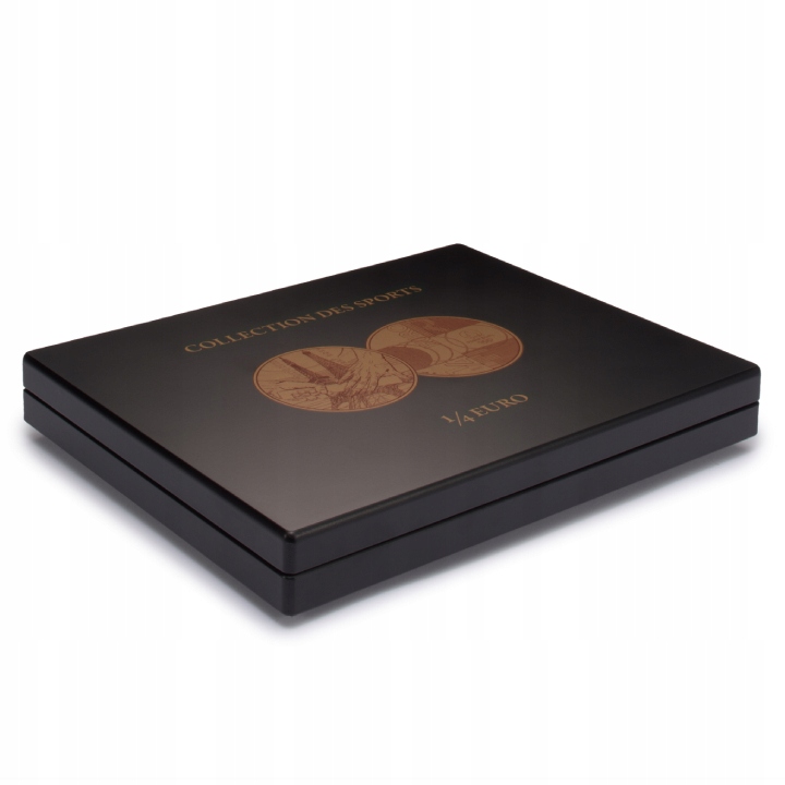 Кассета Leuchtturm - Volterra 19 x 1/4 евро "Collection des Sports" представляет собой уникальное изделие, предназначенное для хранения монет номиналом 19 1/4 евро в пластиковых колпачках. На обложке и на внутренней части кассеты медными надписями «COLLECTION DES SPORTS» и «1/4 EURO», а также представлены аверс и реверс монеты. Внутри футляр обтянут черным бархатом. Кассета изготовлена из дерева, имеет магнитный замок и производится компанией Leuchtturm. Товар не содержит монет.