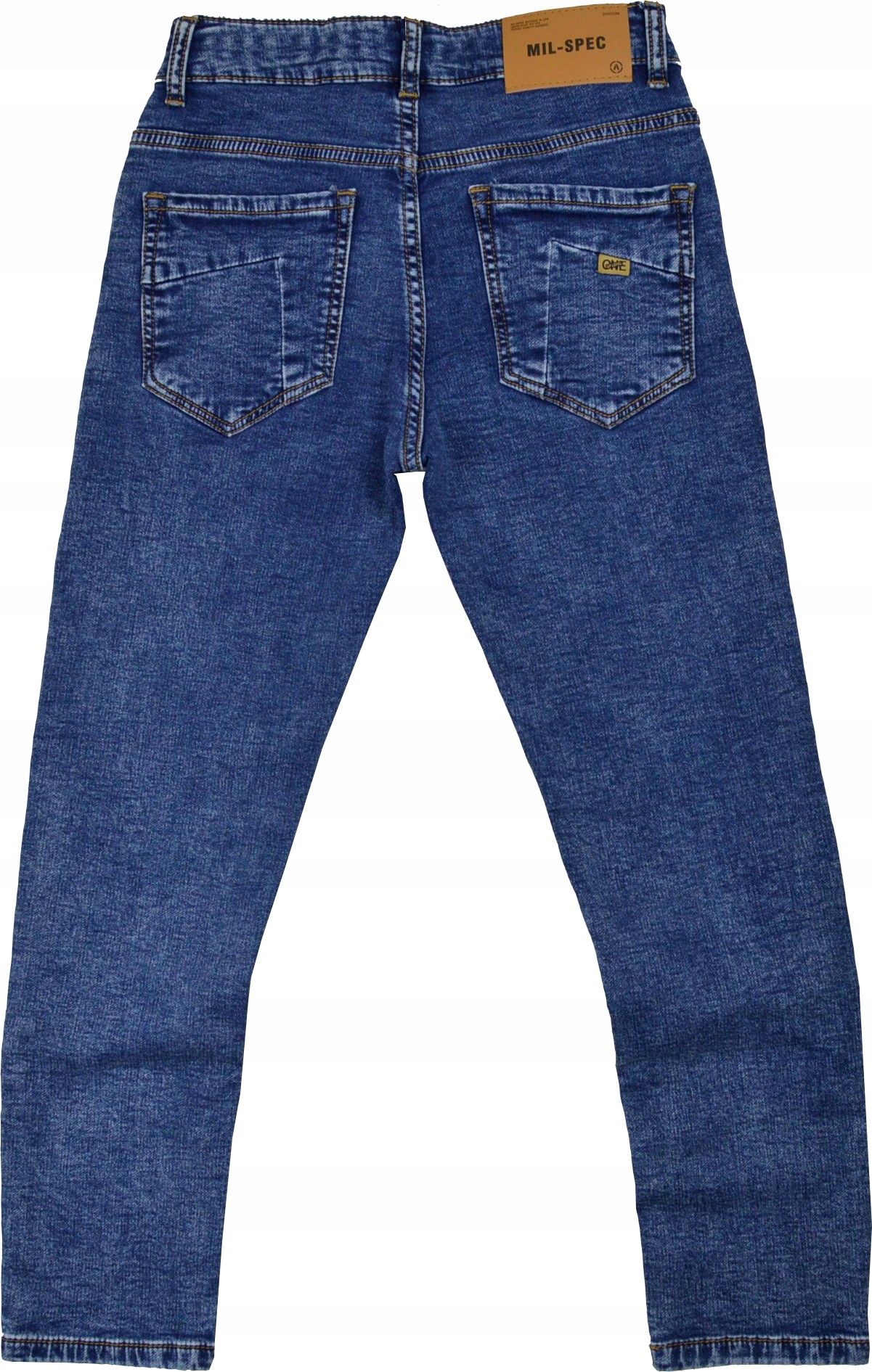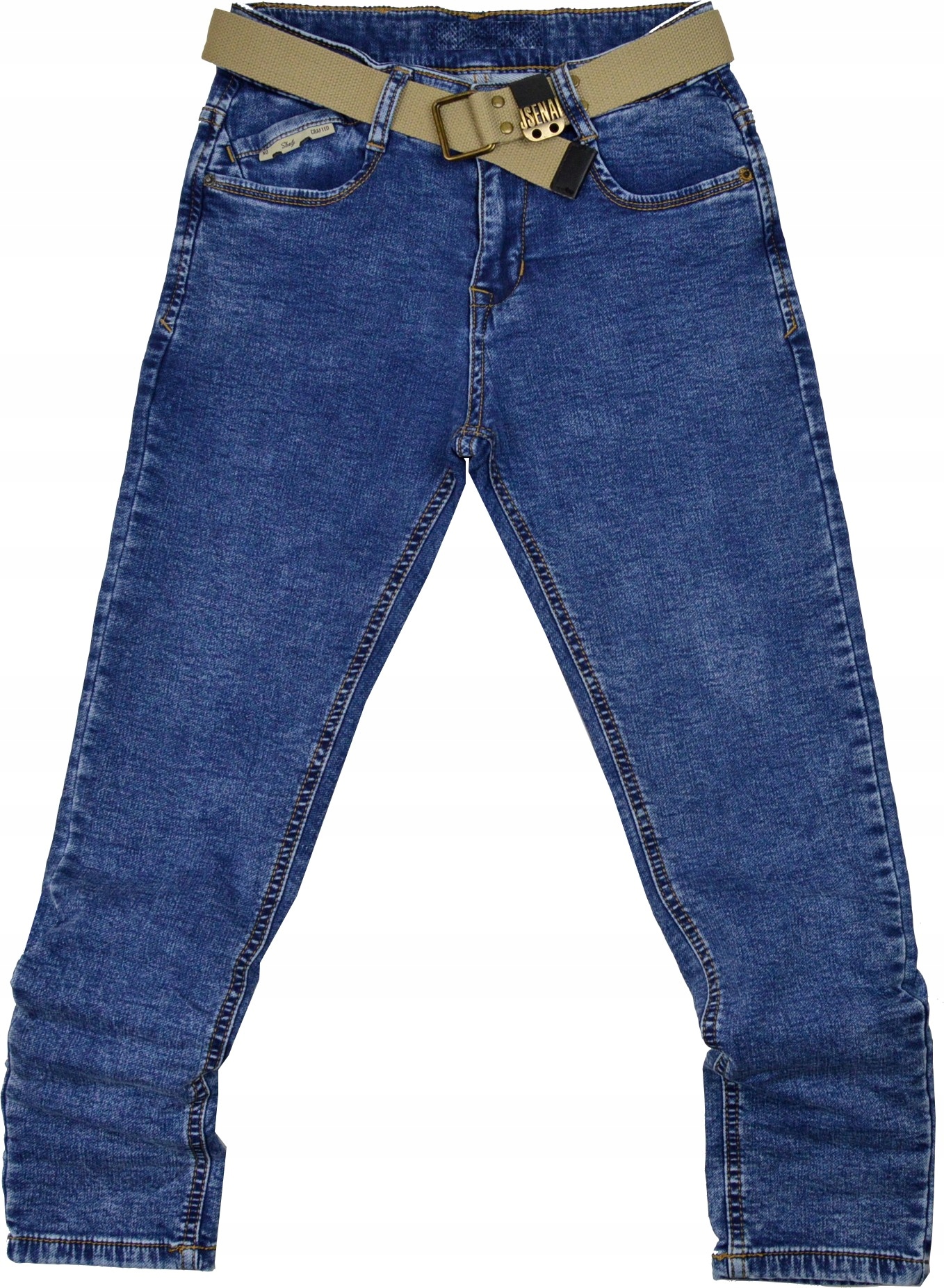 Спереди брюк два больших кармана, усиленных заклепками, и один маленький карман, пришитый под углом, украшенный нашивкой.