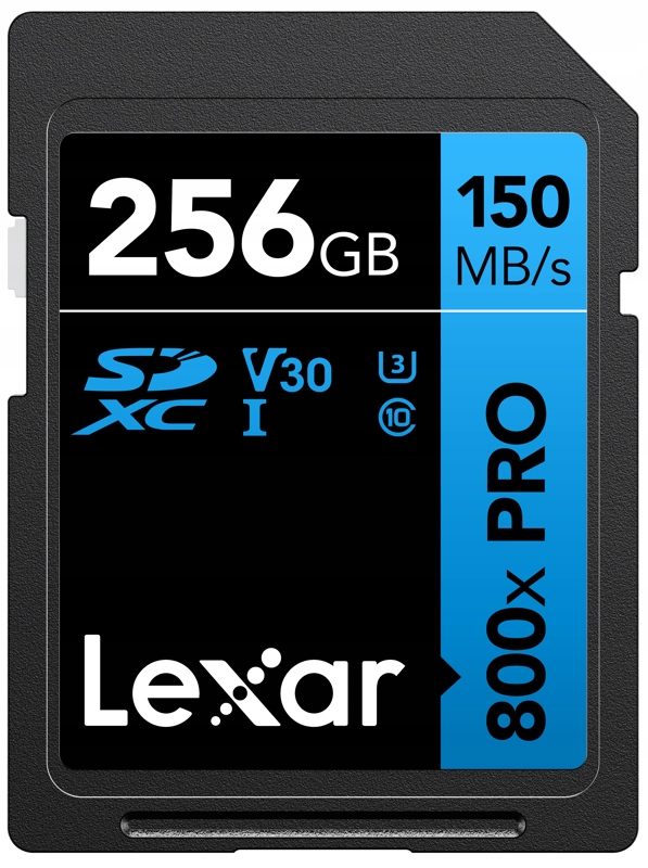 , разработанный для камер «точка и съемки», цифровых SLRS и HD-камер среднего класса, высокоэффективной карты 800x Pro UHS-I SDXC (Blue Series) из Lexar имеет емкость 256 ГБ и может использоваться для 4K, Full HD и 3D-фильмов, а также фото в формате RAW и JPEG. Он может достигать скорости чтения до 150 МБ/с, скорость записи до 45 МБ/с, и благодаря классу скорости V30 скорость записи гарантирует, что он не упадет ниже 30 МБ/с.