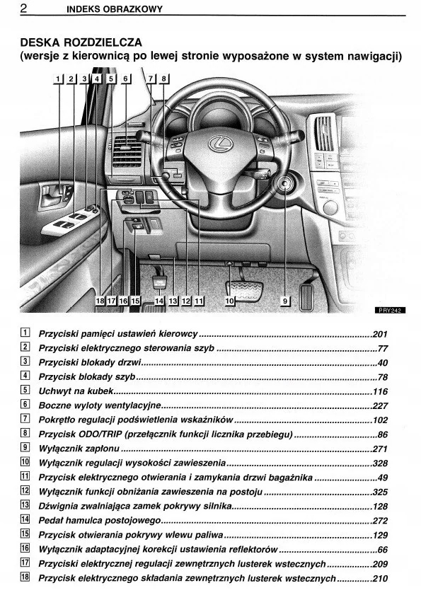 Руководство по эксплуатации Lexus содержит все версии оборудования и полезную информацию о том, как эффективно и безопасно использовать автомобиль, например, индикаторы, контрольные лампы открытия и закрытия, освещение и обзорность, сиденья, отсеки для хранения вещей, отопление, вентиляцию, кондиционер. - советы по вождению, эксплуатации, обслуживанию автомобиля - уровни жидкостей, проверка и доливка, аварийные операции, замена колес, предохранителей, замена лампочек - технические данные... и многое другое, дающее путешественникам ощущение безопасности и комфорта. Польское законодательство обязывает продавца приложить к автомобилю руководство по эксплуатации на польском языке. Руководство пользователя автомобиля новое, на польском языке.